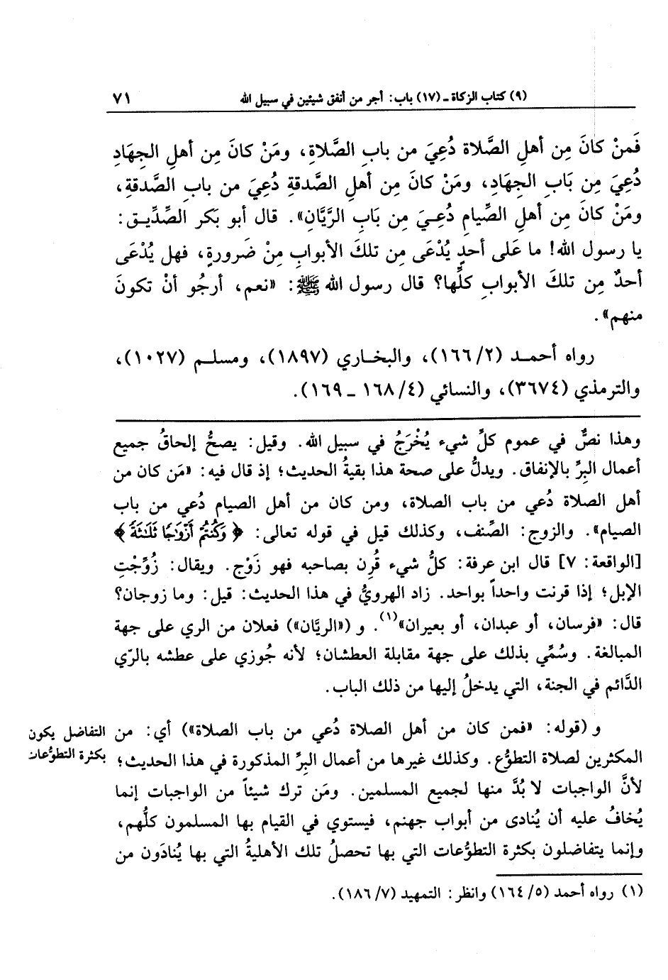 وهذا نصّ في عموم كل شيء يخرج في سبيل الله. وقيل: يصح إلحاق جميع أعمال البرّ بالإنفاق. ويدلّ على صحة هذا بقية الحديث؛ إذ قال فيه: (من كان من أهل الصلاة دعي من باب الصلاة، ومن كان من أهل الصيام دعي من باب الصيام).