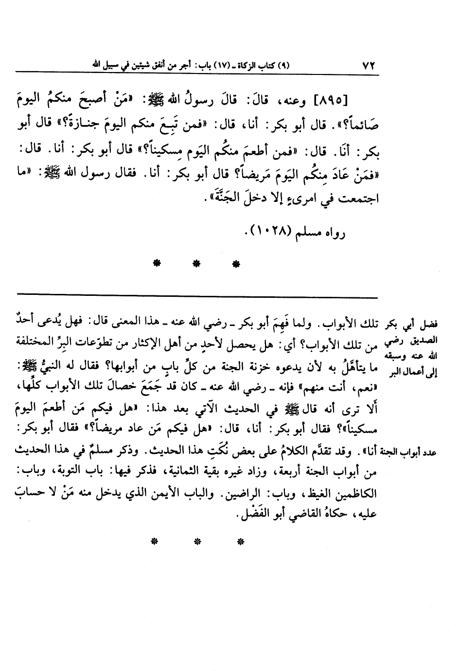 قَالَ أَبُو بَكرٍ: أَنَا، قَالَ: (فَمَن تَبِعَ مِنكُمُ اليَومَ جَنَازَةً؟ ) قَالَ أَبُو بَكرٍ: أَنَا، قَالَ: (فَمَن أَطعَمَ مِنكُمُ اليَومَ مِسكِينًا؟ ) قَالَ أَبُو بَكرٍ: أَنَا. قَالَ: فَمَن عَادَ مِنكُمُ اليَومَ مَرِيضًا؟ قَالَ أَبُو بَكرٍ: أَنَا. فَقَالَ رَسُولُ اللهِ - صلى الله عليه وسلم -: (مَا اجتَمَعت فِي امرِئٍ إِلا دَخَلَ الجَنَّةَ).