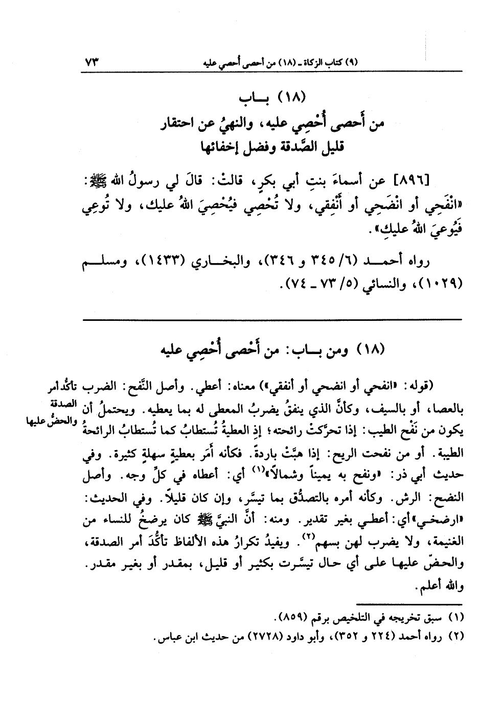 [896] عَن أَسمَاءَ بِنتِ أَبِي بَكرٍ، قَالَت: قَالَ لِي رَسُولُ اللهِ - صلى الله عليه وسلم -: (انفَحِي أَوِ انضَحِي أَو أَنفِقِي، وَلا تُحصِي فَيُحصِيَ اللهُ عَلَيكِ، وَلا تُوعِي فَيُوعِيَ اللهُ عَلَيكِ).