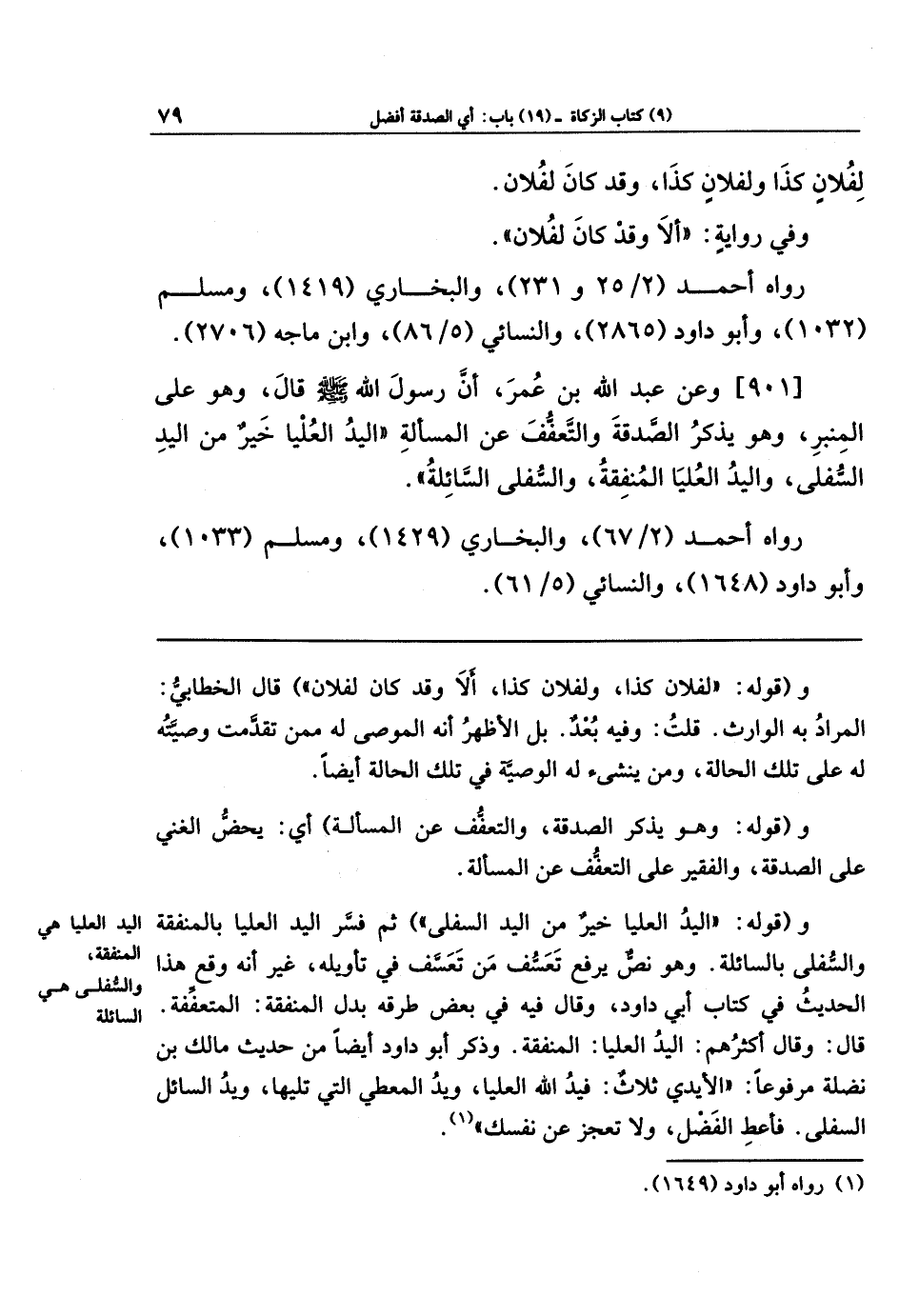 [901] وَعَن عَبدِ اللهِ بنِ عُمَرَ: أَنَّ رَسُولَ اللهِ - صلى الله عليه وسلم - قَالَ وَهُوَ عَلَى المِنبَرِ وَهُوَ يَذكُرُ الصَّدَقَةَ وَالتَّعَفُّفَ عَنِ المَسأَلَةِ (اليَدُ العُليَا خَيرٌ مِنَ اليَدِ السُّفلَى، وَاليَدُ العُليَا المُنفِقَةُ وَالسُّفلَى السَّائِلَةُ).