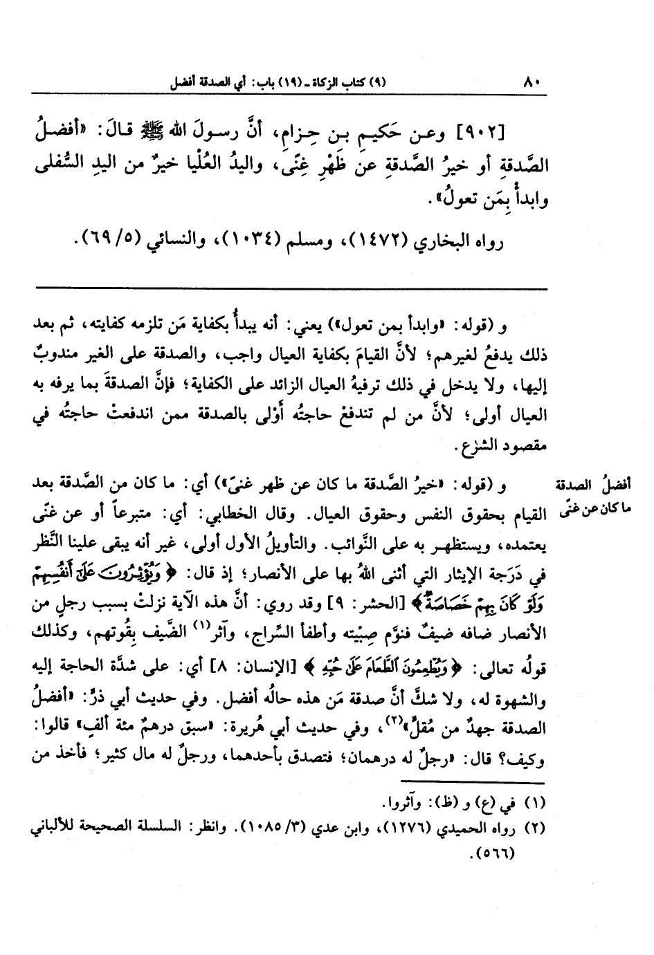 [902] وَعَن حَكِيمَ بنَ حِزَامٍ؛ أَنَّ رَسُولَ اللهِ - صلى الله عليه وسلم - قَالَ: (أَفضَلُ الصَّدَقَةِ، أَو خَيرُ الصَّدَقَةِ عَن ظَهرِ غِنًى، وَاليَدُ العُليَا خَيرٌ مِنَ اليَدِ السُّفلَى، وَابدَأ بِمَن تَعُولُ).