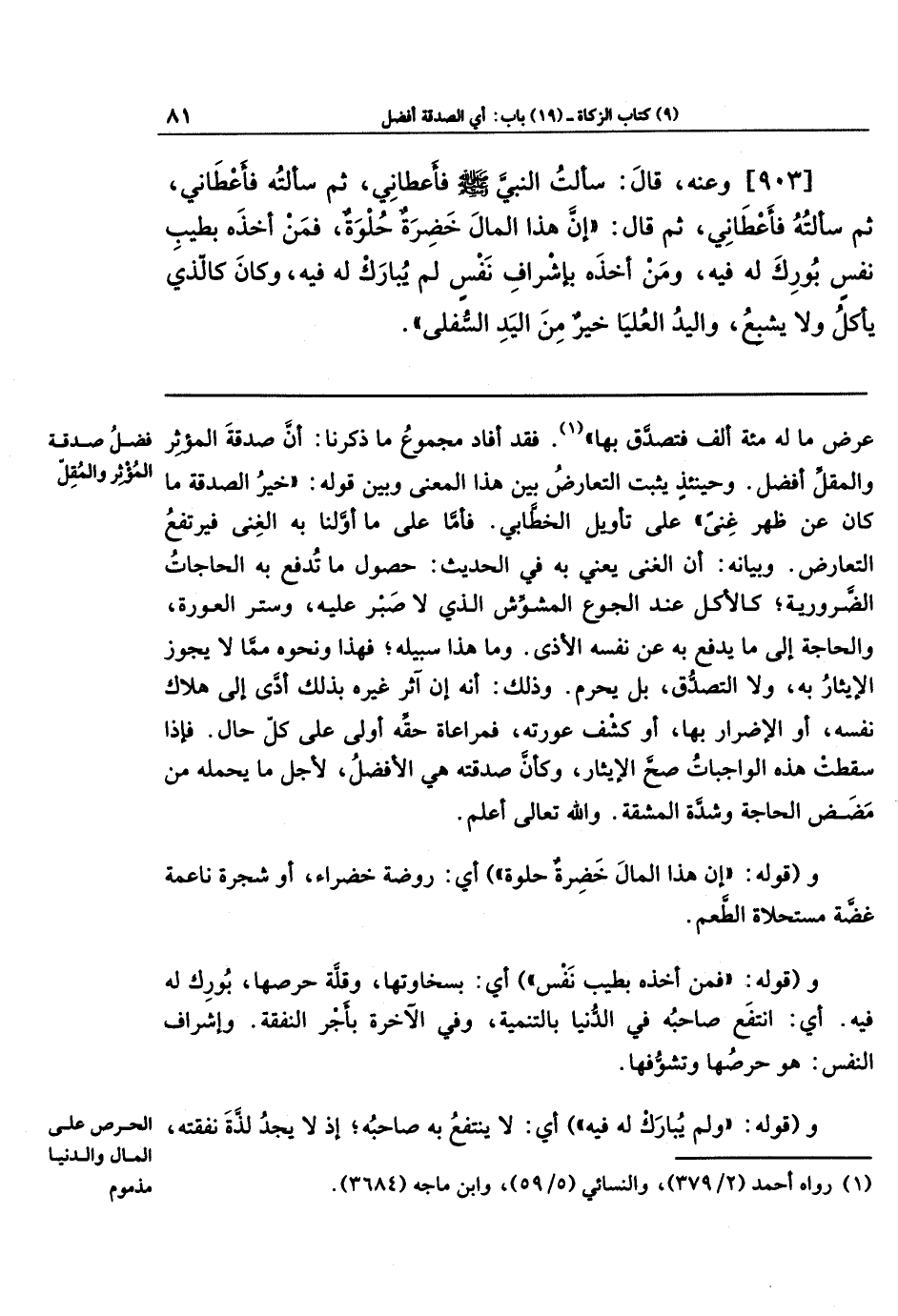 [903] وَعَنهُ قَالَ: سَأَلتُ النَّبِيَّ - صلى الله عليه وسلم - فَأَعطَانِي، ثُمَّ سَأَلتُهُ فَأَعطَانِي، ثُمَّ سَأَلتُهُ فَأَعطَانِي، ثُمَّ قَالَ: (إِنَّ هَذَا المَالَ خَضِرَةٌ حُلوَةٌ، فَمَن أَخَذَهُ بِطِيبِ نَفسٍ بُورِكَ لَهُ فِيهِ، وَمَن أَخَذَهُ بِإِشرَافِ نَفسٍ لَم يُبَارَك لَهُ فِيهِ، وَكَانَ كَالَّذِي يَأكُلُ وَلا يَشبَعُ، وَاليَدُ العُليَا خَيرٌ مِنَ اليَدِ السُّفلَى).