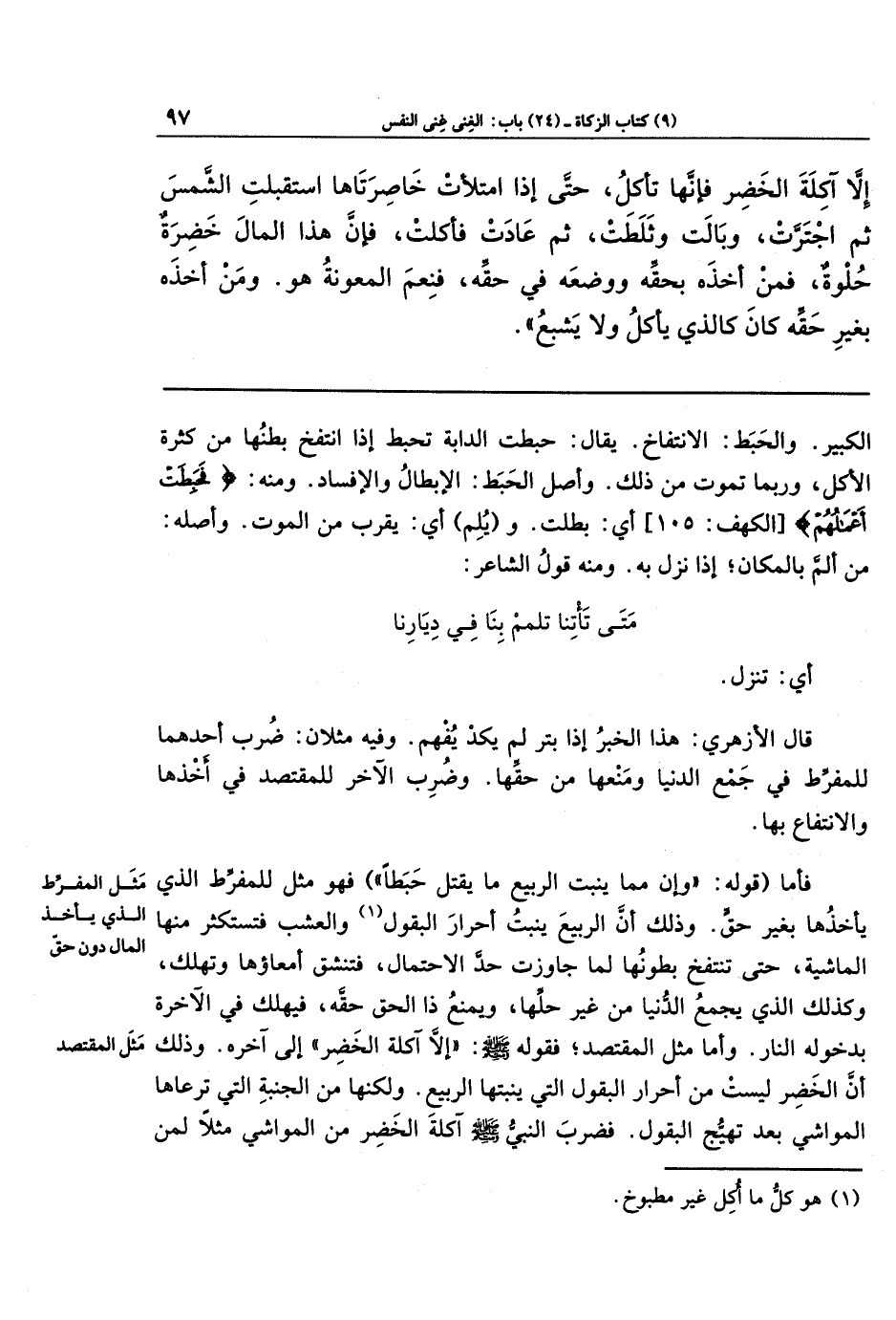 إِلا آكِلَةَ الخَضِرِ فَإِنَّهَا تَأكُلُ، حَتَّى إِذَا امتلأت خَاصِرَتَاهَا استَقبَلَتِ الشَّمسَ ثُمَّ اجتَرَّت. وَبَالَت وَثَلَطَت ثُمَّ عَادَت فَأَكَلَت، فإن هَذَا المَالَ خَضِرَةٌ حُلوَةٌ، فَمَن أَخَذَهُ بِحَقِّهِ وَوَضَعَهُ فِي حَقِّهِ، فَنِعمَ المَعُونَةُ هُوَ. وَمَن أَخَذَهُ بِغَيرِ حَقِّهِ كَانَ كَالَّذِي يَأكُلُ وَلا يَشبَعُ).