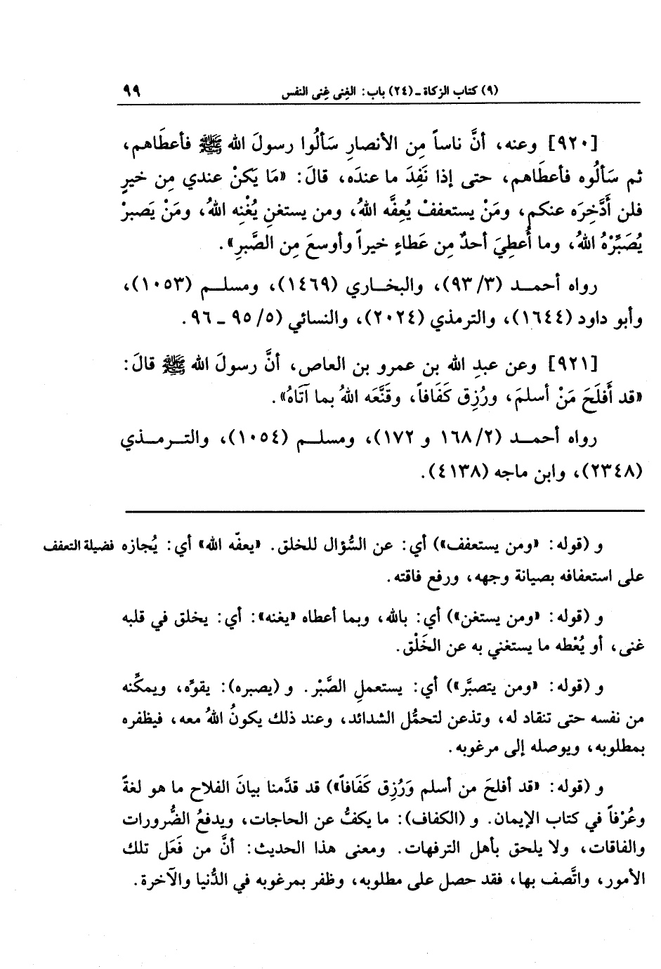 [921] وَعَن عَبدِ اللهِ بنِ عَمرِو بنِ العَاصِ؛ أَنَّ رَسُولَ اللهِ - صلى الله عليه وسلم - قَالَ: (قَد أَفلَحَ مَن أَسلَمَ، وَرُزِقَ كَفَافًا، وَقَنَّعَهُ اللهُ بِمَا آتَاهُ).