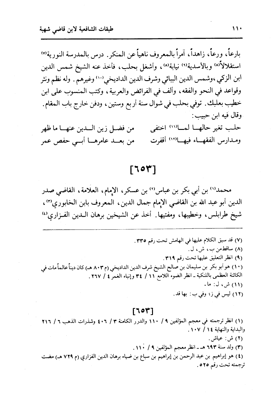 653 - مُحَمَّد بن أبي بكر بن عَبَّاس بن عَسْكَر الإِمَام الْعَلامَة القَاضِي صدر الدَّين أَبُو عبد الله بن القَاضِي الإِمَام جمال الدَّين الْمَعْرُوف بِابْن الخابوري شيخ طرابلس وخطيبها ومفتيها أَخذ عَن الشَّيْخَيْنِ برهَان الدَّين الْفَزارِيّ