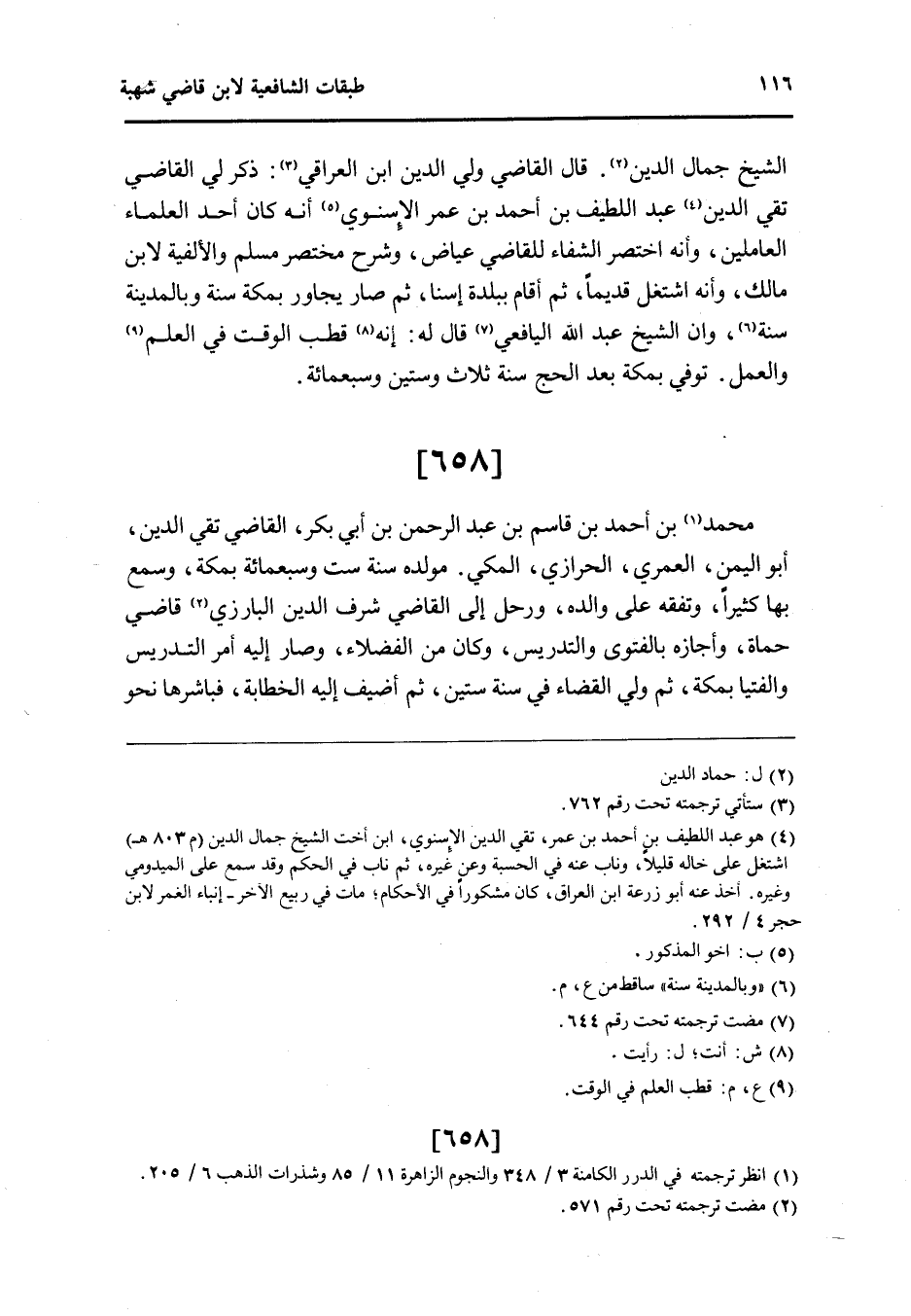 658 - مُحَمَّد بن أَحْمد بن قَاسم بن عبد الرَّحْمَن بن أبي بكر القَاضِي تَقِيّ الدَّين أَبُو الْيمن الْعمريّ الْحرَازِي الْمَكِّيّ مولده سنة سِتّ وَسَبْعمائة بِمَكَّة وَسمع بهَا كثيرا وتفقه على وَالِده ورحل إِلَى القَاضِي شرف الدَّين الْبَارِزِيّ قَاضِي حماة وَأَجَازَهُ بالفتوى والتدريس وَكَانَ من الْفُضَلَاء وَصَارَ إِلَيْهِ أَمر التدريس والفتيا بِمَكَّة ثمَّ ولي الْقَضَاء فِي سنة سِتِّينَ ثمَّ أضيف إِلَيْهِ الخطابة فباشرها نَحْو