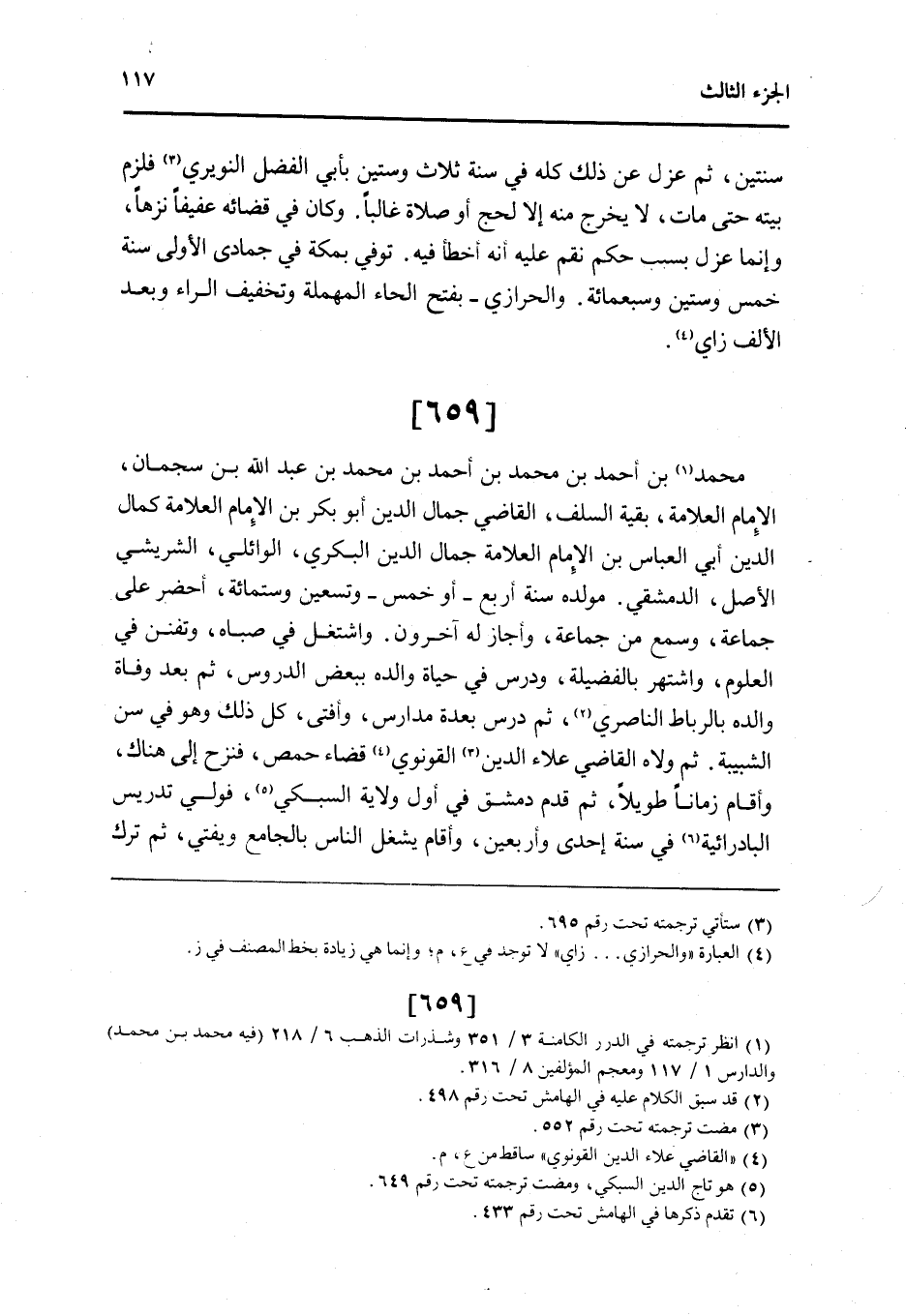 659 - مُحَمَّد بن أَحْمد بن مُحَمَّد بن أَحْمد بن مُحَمَّد بن عبد الله بن سجمان الإِمَام الْعَلامَة بَقِيَّة السّلف القَاضِي جمال الدَّين أَبُو بكر بن الإِمَام الْعَلامَة كَمَال الدَّين أبي الْعَبَّاس بن الإِمَام الْعَلامَة جمال الدَّين الْبكْرِيّ الوائلي الشريشي الأَصْل الدِّمَشْقِي مولده سنة أَربع أَو خمس وَتِسْعين وسِتمِائَة أحضر على جمَاعَة وَسمع من جمَاعَة وَأَجَازَ لَهُ آخَرُونَ واشتغل فِي صباه وتفنن فِي الْعُلُوم واشتهر بالفضيلة ودرس فِي حَيَاة وَالِده بِبَعْض الدُّرُوس ثمَّ بعد وَفَاة وَالِده بالرباط الناصري ثمَّ درس بعدة مدارس وافتى كل ذَلِك وَهُوَ فِي سنّ الشبيبة ثمَّ ولاه القَاضِي عَلَاء الدَّين القونوي قَضَاء حمص فنزح إِلَى هُنَاكَ وَأقَام زَمَانا طَويلا ثمَّ قدم دمشق فِي أول ولَايَة السُّبْكِيّ فولي تدريس البادرائية فِي سنة إِحْدَى وَأَرْبَعين وَأقَام يشغل النَّاس بالجامع ويفتي ثمَّ ترك