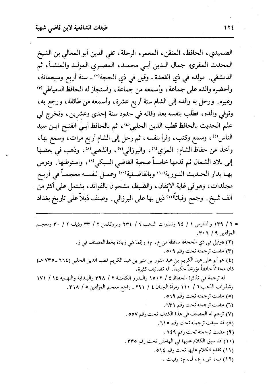 الصميدي الْحَافِظ المتقن المعمر الرحلة تَقِيّ الدَّين أَبُو الْمَعَالِي بن الشَّيْخ الْمُحدث المقرىء جمال الدَّين أبي مُحَمَّد الْمصْرِيّ المولد والمنشأ ثمَّ الدِّمَشْقِي مولده فِي ذِي الْقعدَة وَقيل فِي ذِي الْحجَّة سنة أَربع وَسَبْعمائة وأحضره وَالِده على جمَاعَة وأسمعه من جمَاعَة واستجاز لَهُ الْحَافِظ الدمياطي وَغَيره ورحل بِهِ وَالِده إِلَى الشَّام سنة أَربع عشرَة وأسمعه من طَائِفَة وَرجع بِهِ وَتُوفِّي وَالِده فَطلب بِنَفسِهِ بعد وَفَاته فِي حُدُود سنة إِحْدَى وَعشْرين وَتخرج فِي علم الحَدِيث بِالْحَافِظِ قطب الدَّين الْحلَبِي ثمَّ بِالْحَافِظِ أبي الْفَتْح ابْن سيد النَّاس وَسمع وَكتب وَقَرَأَ بِنَفسِهِ ثمَّ رَحل إِلَى الشَّام أَربع مَرَّات وَسمع بهَا وَأخذ عَن حفاظ الشَّام الْمزي والبرزالي والذهبي وَذهب فِي بَعْضهَا إِلَى بِلَاد الشمَال ثمَّ قدمهَا خَامِسًا صُحْبَة القَاضِي السُّبْكِيّ واستوطنها ودرس بهَا بدار الحَدِيث النورية وبالفاضلية وَعمل لنَفسِهِ معجما فِي أَربع مجلدات وَهُوَ فِي غَايَة الإتقان والضبط مشحون بالفوائد يشْتَمل على أَكثر من ألف شيخ وَجمع وفياتا ذيل بهَا على البرزالي وصنف ذيلا على تَارِيخ بَغْدَاد