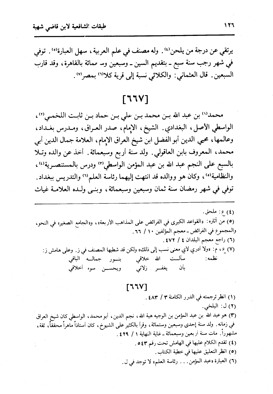 667 - مُحَمَّد بن عبد الله بن مُحَمَّد بن عَليّ بن حَمَّاد بن ثَابت اللَّخْمِيّ الوَاسِطِيّ الأَصْل الْبَغْدَادِيّ الشَّيْخ الإِمَام صدر الْعرَاق ومدرس بَغْدَاد وعالمها محيي الدَّين أَبُو الْفضل ابْن شيخ الْعرَاق الإِمَام الْعَلامَة جمال الدَّين أبي مُحَمَّد الْمَعْرُوف بِابْن العاقولي ولد سنة أَربع وَسَبْعمائة أَخذ عَن وَالِده وتلا بالسبع على النَّجْم عبد الله بن عبد الْمُؤمن الوَاسِطِيّ ودرس بالمستنصرية والنظامية وَكَانَ هُوَ ووالده قد انْتَهَت إِلَيْهِمَا رئاسة الْعلم والتدريس بِبَغْدَاد توفّي فِي شهر رَمَضَان سنة ثَمَان وَسَبْعمائة وَبنى وَلَده الْعَلامَة غياث