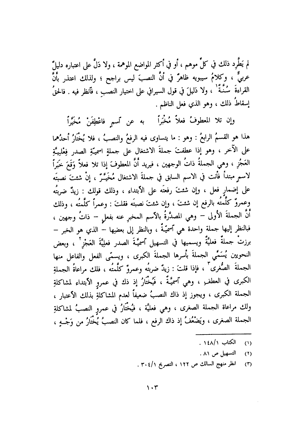 لم يطّرد ذلك في كلّ موهم, أو في أكثر المواضع الموهمة, ولا دلّ على اعتباره دليلٌ عربيٌ, وكلامث سيبويه ظاهرٌ في أنّ النصبَ ليس براجح؛ ولذلك اعتذر بأنّ القراءةَ سُنّةٌ, ولا دليلَ في قول السيرافي على اختيار النصبِ, فانظر فيه. فالحقُ إسقاطُ ذلك, وهو الذي فعل الناظم.