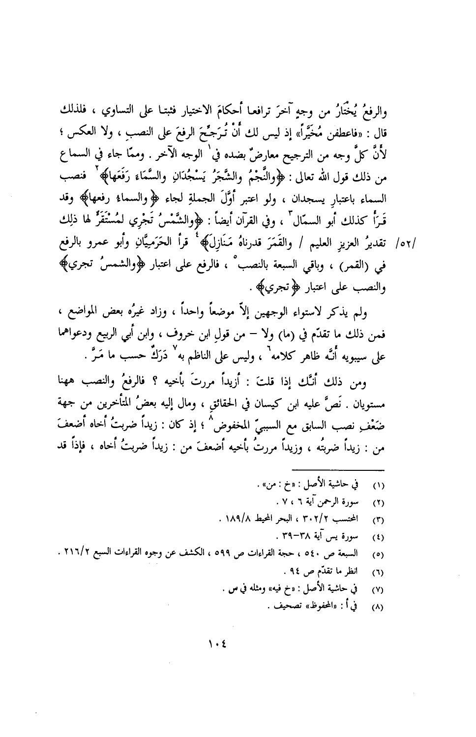 والرفعُ يُختارُ من وجهٍ آخرَ ترافعا أحكامَ الاختيار فثبتا على التساوي, فلذلك قال: ((فاعطفن مُخَيّرًا)) إذ ليس لك انْ تُرَجِّحَ الرفعَ على النصبِ, ولا العكس؛ لأنّ كلَّ وجه من الترجيح معارضٌ بضده في الوجه الآخر. ومما جاء في السماع من ذلك قول الله تعالى: {والنَّجْمُ والشّجرُ يَسْجُدَانِ والسَّماءَ رَفَعَها} فنصب السماء باعتبار يسجدان, ولو اعتبر أوّلَ الجملة لجاء {والسماءُ رفعها} وقد قَرَأ كذلك أبو السمّال, وفي القرآن أيضًا: {والشَّمْسُ تَجْرِي لمُسْتَقرٍّ لها ذلك تقديرُ العزيزِ العليم/ والقَمَرَ قدرناهُ مَنَازِلَ} قرأ الحَرَميَّانِ وأبو عمرو بالرفع في (القمر) , وباقي السبعة بالنصب, فالرفع على اعتبار {والشمسُ تجري} والنصب على اعتبار {تجري}.