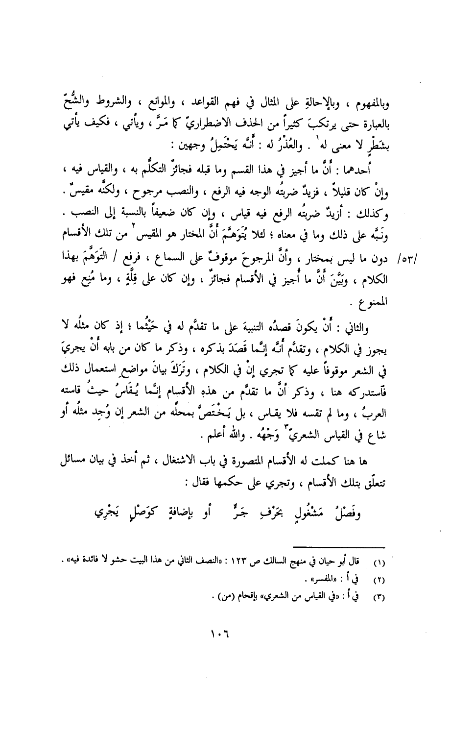 والثاني: أنْ يكون قصدُه التنبيهَ على ما تقدّم له في حيثُما؛ إذ كان مثلُه لا يجوز في الكلام, وتقدّم أنّه إنّما قَصَدَ بذكره, وذكرَ ما كان من بابه أنْ يجريَ في الشعر موقوفًا عليه كما تجري إنْ في الكلام, وتَرَكَ بيانَ مواضعِ استعمال ذلك فاستدركه هنا, وذكر أنَّ ما تقدّم من هذه الأقسام إنّما يُقاسُ حيثُ قاسته العربُ, وما لم تقسه فلا يقاس, بل يَخْتصَّ بمحلّه من الشعر إن وُجِد مثلُه أو شاء في القياس الشعريّ وَجُهه. والله أعلم.