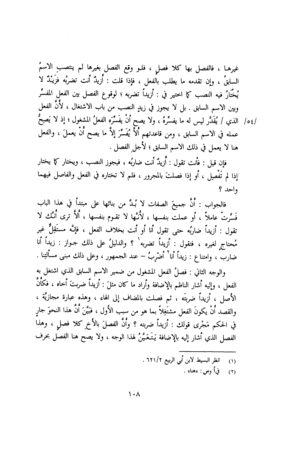 غيرها, فالفصل بها كلا فصلٍ, فلو وقع الفصل بغيرها لم ينتصب الاسمُ السابقُ, وإن تقدمه ما يطلب بالفعل, فإذا قلت: ازيدٌ انت تضربُه فزيدٌ لا يُختارُ فيه النصب كما اختير في: ازيدًا تضربه؛ لوقوع الفصل بين الفعل المفسّر وبين الاسم السابق. بل لا يجوز في زيدٍ النصب من باب الاشتغال, لأنّ الفعل / الذي/ يُقدّر ليس له ما يُفسّرهُ, ولا يصح أنْ يفسّره الفعلُ المشغول؛ إذ لا يَصِحُ عمله في الاسم السابق, ومن قاعدتهم ألّا يُفسّرَ إلّا ما يصح أنْ يعملَ, والفعل هنا لا يعمل في الاسم السابق؛ لاجلِ الفصل.