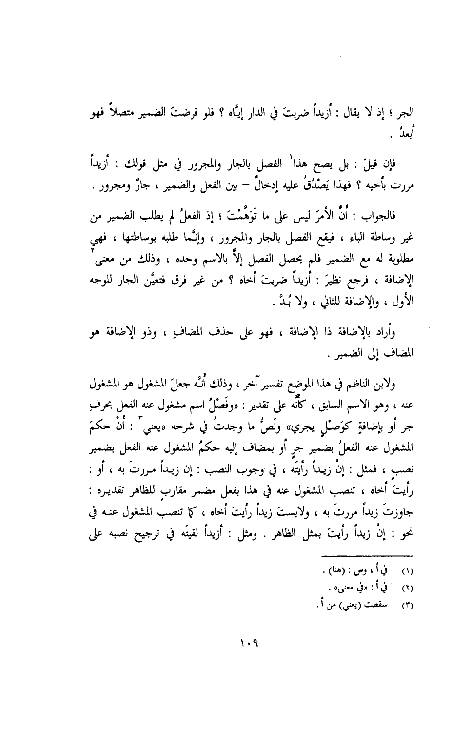 فالجواب: أنّ الأمرَ ليس على ما توهّمتَ؛ إذ الفعلُ لم يطلب الضمير من غير وساطة الباء, فيقع الفصل بالجار والمجرور, وإنّما طلبه بوساطتها, فهي مطلوبة له مع الضمير فلم يحصل الفصل إلّا بالاسم وحده, وذلك من معنى الإضافة, فرجع نظيرَ: أزيدًا ضربتَ أخاه؟ من غير فرق فتعيّن الجار للوجه الأول, والإضافة للثاني, ولا بُدَّ.