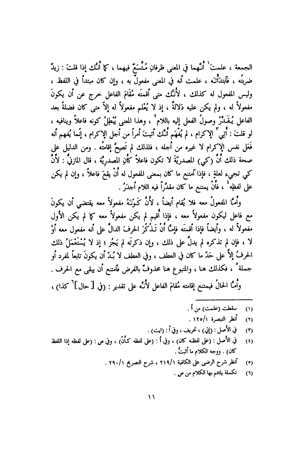 الجمعة، علمتَ أنهما في المعنى ظرفانِ مُتَّسَعٌ فيهما، كما أنَّك إذا قلتَ: زيدٌ ضربتُه، فابتدَأتَه، علمت أنه في المعنى مفعولٌ به، وإن كان مبتدأ في اللفظ، وليس المفعول له كذلك، لأنَّك متى أقمتَه مُقَامَ الفاعل خرج عن أن يكونَ مفعولاً له، ولم يكن عليه دلالةٌ، إذ لا يُعلم مفعولاً له إلا متى كان فضلةً بعد الفاعل يُقَدَّرُ وصولُ الفعل إليه باللام، وهذا المعنى يُبطلُ كونه فاعلاً ويُنافيه، لو قلتَ: أُتِي الإكرام، لم يُفْهَم أنَّك أتيت أمراً من أجل الإكرام، إنّما يُفهم أنه فَعَل نفس الإكرام لا غيره من أجله، فلذلك لم تَصِحَّ إقامتُه. ومن الدليل على صحة ذلك أنَّ (كي) المصدريَّة لا تكون فاعلاً كأَن المصدرية، قال المازني: لأنَّ كي تجيء لعلةٍ، فإذا امتنع ما كان بمعنى المفعول له أنْ يقَعَ فاعلاً، وإن لم يكن على لفظِه، فأنْ يمتنع ما كان مقدَّراً فيه اللام أجدَرُ.