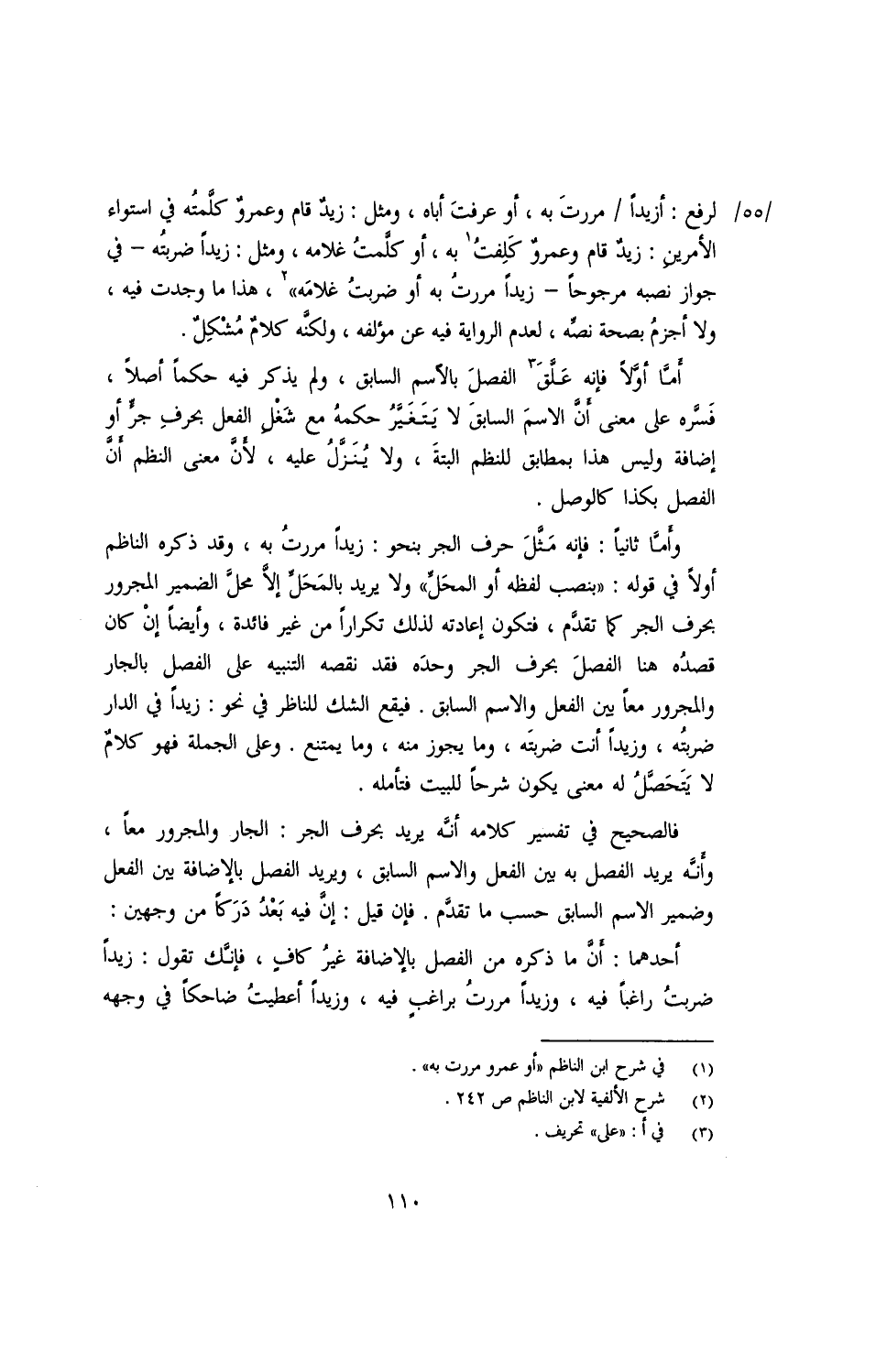 فالصحيح في تفسير كلامه أنّه يريد بحرف الجر: الجار والمجرور معًا, وأنّه يريد الفصل به بين الفعل والاسم السابق, ويريد الفصل بالإضافة بين الفعل وضمير الاسم السابق حسب ما تقدّم. فإن قيل: إنّ فيه بَعدُ دَرَكًا من وجهين: