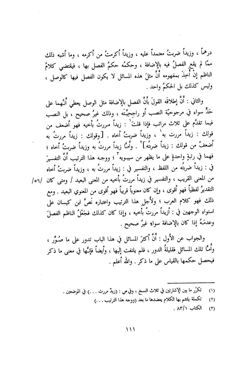 والثاني: أنَّ إطلاقه القولَ بأنَّ الفصل بالإضافة مثل الوصل يعطي أنّهما على حدّ سواء في مرجوحية النصب أو راجحيّته, وذلك غير صحيح, بل النصب فيما تقدّم على ثلاث مراتب فإذا قلت: زيدًا مررتُ بأخيه فهو أضعف من قولك: زيدًا مررت به, وزيدًا ضربتُ أخاه [وقولك: زيدًا مررتُ به أضعفُ من قولك: زيدًا ضربتُه] , وأما زيدًا مررتُ به وزيدًا ضربتُ أخاه؛ فهما في رتبة واحدة على ما يظهر من سيبويه؛ ووجه هذا الترتيب أنّ التفسير في: زيدًا ضربتُه من اللفظ, والتفسير في: زيدًا مررتُ به وزيدًا ضربتُ أخاه من المعنى القريب, والتفسير في زيدًا مررتُ بأخيه من المعنى البعيد/ ومتى كان التقديرُ لفظيًا فهو أقوى, وإن كان معنويًا قريبًا فهو أقوى من المعنوي البعيد. ومع ذلك فهو كلام العرب؛ ولأجل هذا الترتيب واعتباره نصّ ابن كيسان على استواء الوجهين في: أزيدًا مررتُ بأخيه, وإذا كان كذلك فجَعْلُ الناظم الفصل وعدمه إذا كان بالإضافة سواء غيرُ صحيح.
