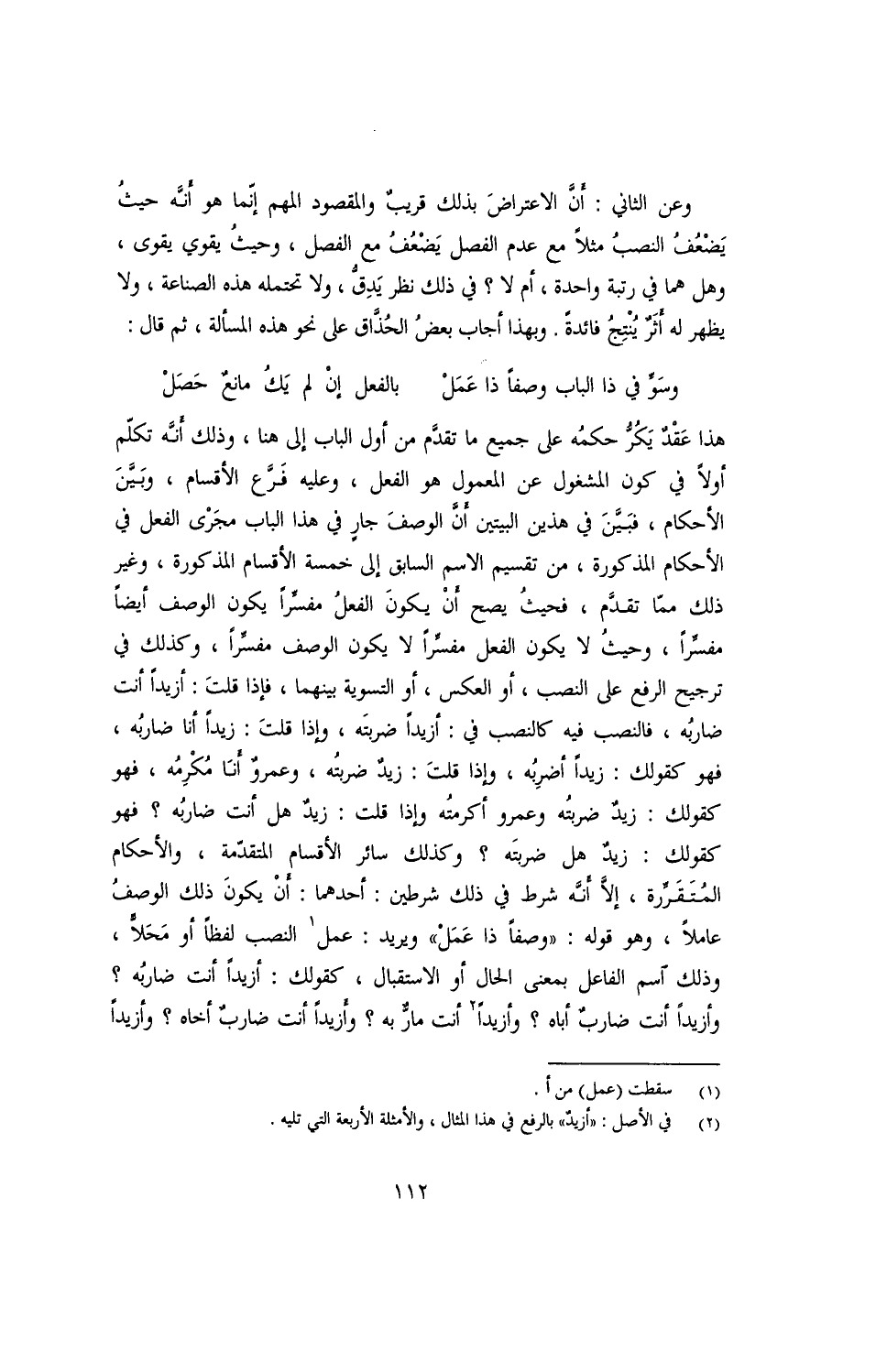 هذا عقدٌ يكُرُّ حكمُه على جميع ما تقدّم من أول الباب إلى هنا, وذلك أنّه تكلّم أولًا في كون المشغول عن المعمول هو الفعل, وعليه فرّع الأقسام, وبيّن الأحكام, فبيّن في هذين البيتين أنّ الوصف جارٍ في هذا الباب مجرى الفعل في الأحكام المذكورة, من تقسيم الاسم السابق إلى خمسة الأقسام المذكورة, وغير ذلك ممّا تقدّم, فحيث يصح أنْ يكونَ الوصف مفسّرًا, وكذلك في ترجيح الرفع على النصب, أو العكس, أو التسوية بينهما, فإذا قلت: أزيدًا أنت ضاربُه, فالنصب فيه كالنصب في: أزيدًا ضربتَه, وإذا قلت: زيدًا أنا ضاربُه, فهو كقولك: زيدًا أضرِبُه, وإذا قلت: زيدٌ ضربتُه, وعمروٌ أنا مكرِمُه, فهو كقولك: زيدٌ ضربتُه وعمرو أكرمته وإذا قلت: زيدٌ هل أنت ضاربُه؟ فهو كقولك: زيدٌ هل ضربتَه؟ وكذلك سائر الأقسام المتقدّمة, والأحكام المتقرّرة, إلّا أنّه شرط في ذلك شرطين: أحدهما: أنْ يكونَ ذلك الوصفُ عاملًا, وهو قوله: ((وصفًا ذا عملْ)) ويريد: عمل النصب لفظًا أو محلًّا, وذلك اسم الفاعل بمعنى الحال أو الاستقبال, كقولك: أزيدًا أنت ضاربُه؟ وأزيدًا أنت ضاربٌ أباه؟ وأزيدًا أنت مارٌّ به؟ وأزيدًا أنت ضاربٌ أخاه؟ وأزيدًا