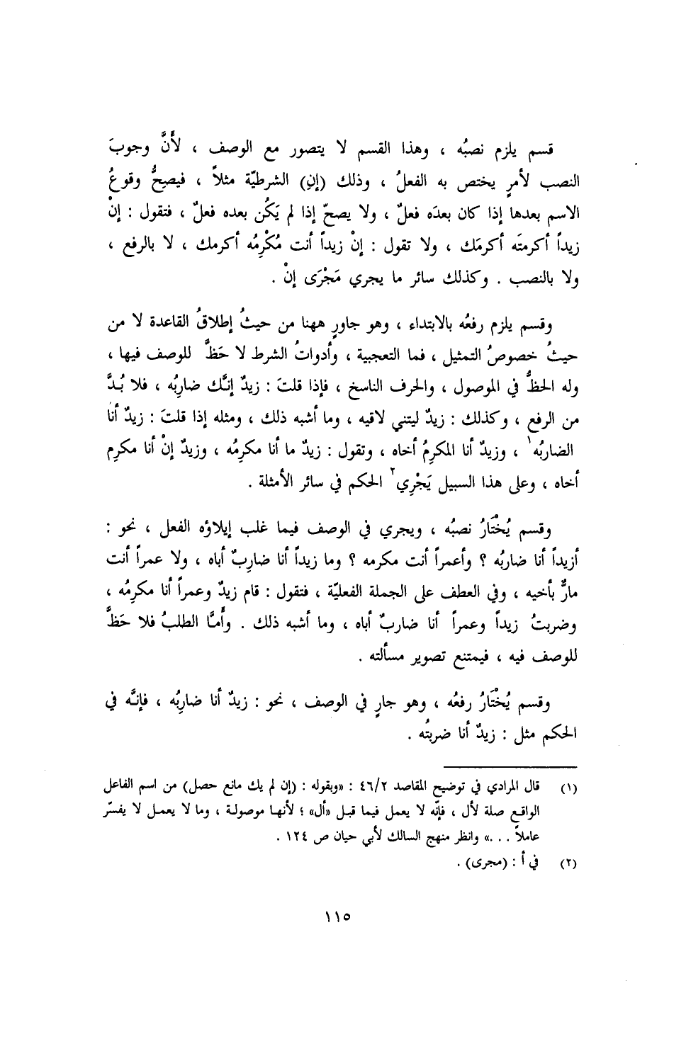 وقسم يلزم رفعه بالابتداء, وهو جاور ههنا من حيث إطلاق القاعدة لا من حيثُ خصوصُ التمثيل, فما التعجبية, وأدوات الشرط لا حظّ للوصف فيها, وله الحظ في الموصول, والحرف الناسخ, فإذا قلت: زيد إنّك ضاربُه, فلا بدّ من الرفع, وكذلك: زيدٌ ليتني لاقيه, وما أشبه ذلك, ومثله إذا قلت: زيدٌ أنا الضاربه, وزيدٌ أنا المكرمُ أخاه, وتقول: زيدٌ ما أنا مكرِمه, وزيدٌ إنْ أنا مكرِم أخاه, وعلى هذا السبيل يجري الحكم في سائر الأمثلة.