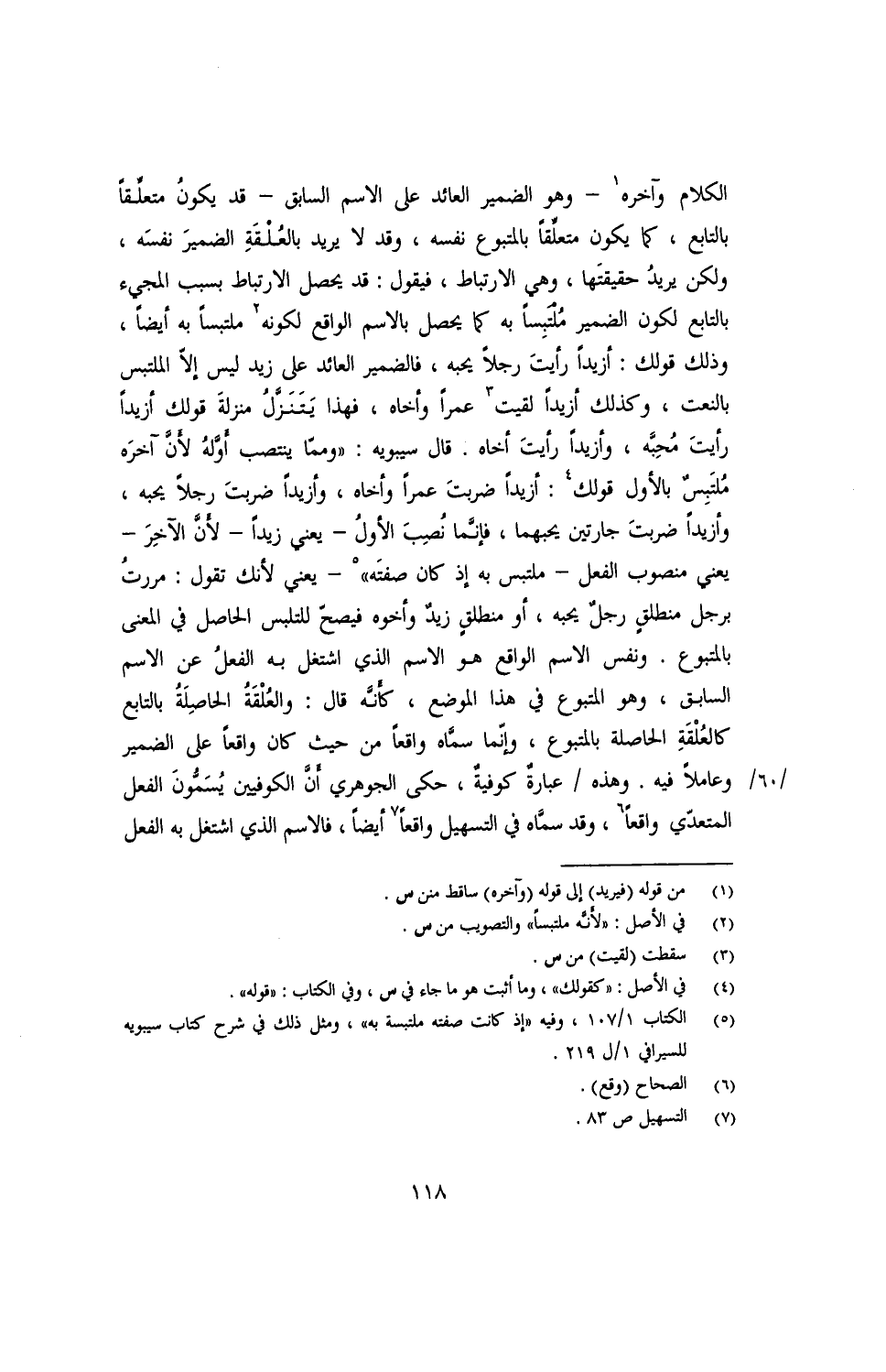 الكلام وآخره- وهو الضمير العائد على الاسم السابق- قد يكون متعلقا بالتابع، كما يكون متعلقا بالمتبوع نفسه، وقد لا يريد بالعلقة الضمير نفسه، ولكن يريد حقيقتها، وهي الارتباط، فيقول: قد يحصل الارتباط بسبب المجيء بالتابع لكون الضمير ملتبسا به كما يحصل بالاسم الواقع لكونه ملتبسا به أيضا، وذلك قولك: أزيدا رأيت رجلا يحبه، فالضمير العائد على زيد ليس إلا الملتبس بالنعت، وكذلك أزيدا لقيت عمرا وأخاه، فهذا يتنزل منزلة قولك أزيدا رأيت محبه، وأزيدا رأيت أخاه. قال سيبويه: "ومما ينتصب أوله لأن آخره ملتبس بالأول قولك: أزيدا ضربت عمرا وأخاه، وأزيدا ضربت رجلا يحبه، وأزيدا ضربت جارتين يحبهما، فإنما نصب الأول- يعني زيدا- لأن الآخر- يعني منصوب الفعل- ملتبس به إذ كان صفته"- يعني لأنك تقول: مررت برجل منطلق رجل يحبه، أو منطلق زيد وأخوه فيصح للتلبس الحاصل في المعنى المتبوع. ونفس الاسم الواقع هو الاسم الذي اشتغل به الفعل عن الاسم السابق، وهو المتبوع في هذا الموضع، كأنه قال: والعلقة الحاصلة بالتابع كالعلقة الحاصلة بالمتبوع، وإنما سماه واقعا من حيث كان واقعا على الضمير وعاملا فيه. وهذا/ عبارة كوفية، حكى الجوهري أن الكوفيين يسمون الفعل المتعدى واقعا، وقد سماه في التسهيل واقعا أيضا، فالاسم الذي اشتغل به الفعل
