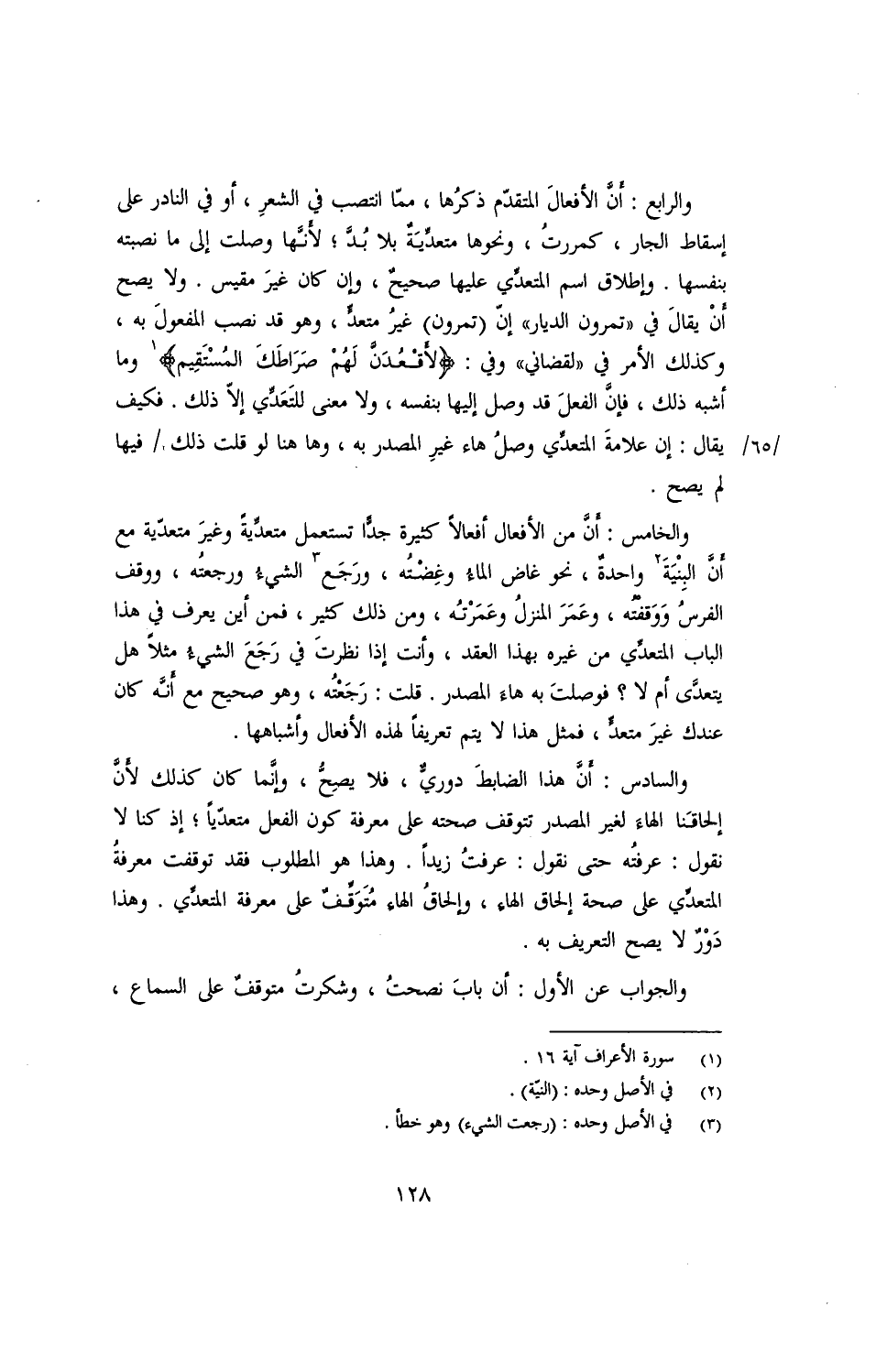 والرابع: أن الأفعال المتقدم ذكرها، مما انتصب في الشعر، أو في النادر على إسقاط الجار، كمررت، ونحوها متعدية بلا بد؛ لأنها وصلت إلى ما نصبته بنفسها. وإطلاق اسم المتعدي عليها صحيح، وإن كان غير مقيس. ولا يصح أن يقال في "تمرون الديار" إن (تمرون) غير متعد، وهو قد نصب المفعول به، وكذل الأمر في "لقضاني" وفي: {لأقعدن لهم صراطك المستقيم} وما أشبه ذلك، فإن الفعل قد وصل إليها بنفسه، ولا معنى للتعدي إلا ذلك. فكيف يقال: إن علامة المتعدي وصل هاء غير المصدر به، وها هنا لو قلت ذلك/ فيها لم يصح.