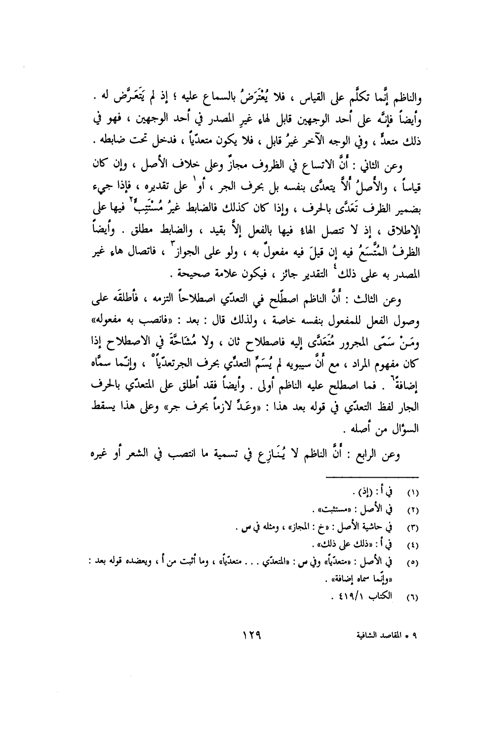 وعن الثالث: أن الناظم اصطلح في التعدي اصطلاحا التزمه، فأطلقه على وصول الفعل للمفعول بنفسه خاصة، ولذلك قال: بعد: "فانصب به مفعوله" ومن سمى المجرور متعدى إليه فاصطلاح ثان، ولا مشاحة في الاصطلاح إذا كان مفهوم المراد، مع أن سيبويه لم يسم التعدي بحرف الجر تعديا، وإنما سماه إضافة. فما اصطلح عليه الناظم أولى. وأيضا فقد أطلق على المتعدي بالحرف الجار لفظ التعدي في قوله بعد هذا: "وعد لازما بحرف جر" وعلى هذا يسقط السؤال من أصله.