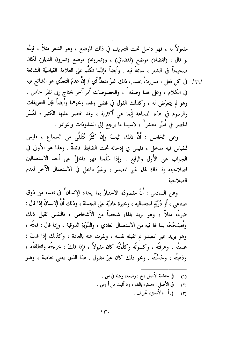 وعن السادس: أن مقصوده الاختبار بما يجده الإنسان في نفسه من ذوق صناعي، أو دربة استعماليه، وخبرة عادية على الجملة، وذلك أن الإنسان إذا قال: ضربته مثلا، وهو يريد بالهاء شخصا من الأشخاص، فالنفس تقبل ذلك وتصححه بما لها فيه من الاستعمال العادي، والدربة الذوقية، وإذا قال: قمته، وهو يريد غير المصدر لم تقبله نفسه، ونفرت عنه بالعادة، وكذلك إذا قلت: علمته، وعرفته، وكسوته وكلمته كان مقبولا، فإذا قلت: خرجته وانطلقته، وذهبته، وحسنته. ونحو ذلك كان غير مقبول. هذا الذي يعني خاصة، وهو