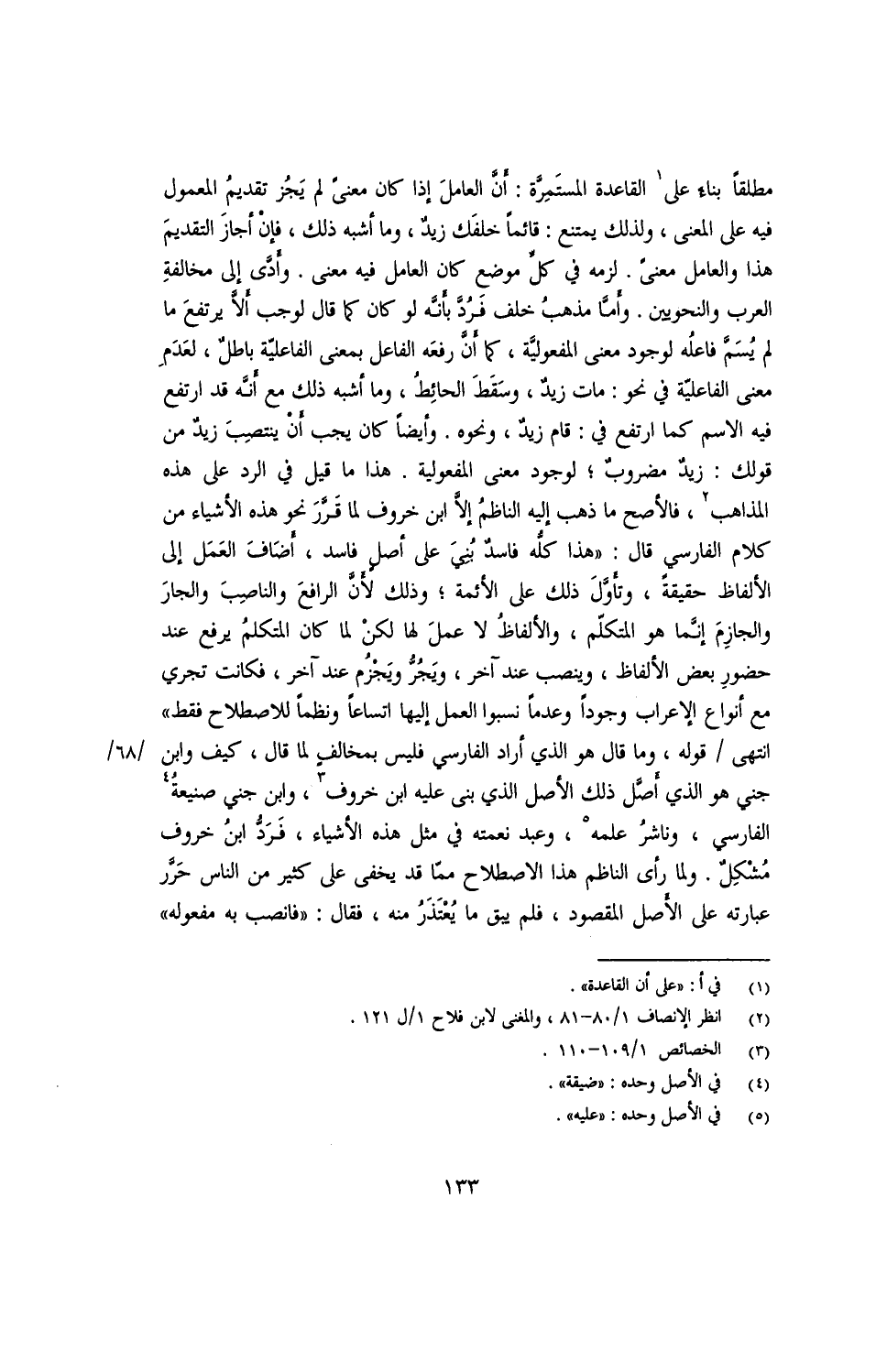 مطلقا بناء على القاعدة المستمرة: أن العامل إذا كان معنى لم يجز تقديم المعمول فيه على المعنى، ولذلك يمتنع: قائما خلفك زيد، وما أشبه ذلك، فإن أجاز التقديم هذا والعامل معنى. لزمه في كل موضع كان العامل فيه معنى. وأدى إلى خالفه العرب والنحويين. وأما مذهب خلف فرد بأنه لو كان كما قال لوجب ألا يرتفع ما لم يسم فاعله لوجود معنى المفعولية، كما أن رفعه الفاعل بمعنى الفاعلية باطل، لعدم معنى الفاعلية في نحو: مات زيد، وسقط الحائط، وما أشبه ذلك مع أنه قد ارتفع فيه الاسم كما ارتفع في: قام زيد، ونحوه. وأيضا كان يجب أن ينتصب زيد من قولك: زيد مضروب؛ لوجود معنى المفعولية. هذا ما قيل في الرد على هذه المذاهب، فالأصح ما ذهب إليه الناظم إلا ابن خروف لما قرر نحو هذه الأشياء من كلام الفارسي قال: "هذا كله فاسد بني على أصل فاسد، أضاف العمل إلى الألفاظ حقيقة، وتأول ذلك على الأئمة؛ وذلك لأن الرافع والناصب والجار والجازم إنما هو المتكلم، والألفاظ لا عمل لها لكن لما كان المتكلم يرفع عد حضور بعض الألفاظ، وينصب عند آخر، ويجر ويجزم عند آخر، فكانت تجري مع أنواع الإعراب وجودا وعدما نسبوا العمل إليها اتساعا ونظما للاصطلاح فقط" انتهى/ قوله، وما قال هو الذي أراد الفارسي فليس بمخالف لما قال، كيف وابن جنى هو الذي أصل ذلك الأصل الذي بني عليه ابن خروف، وابن جنى صنيعة الفارسي، وناشر علمه، وعبد نعمته في مثل هذه الأشياء، فرد ابن خروف مشكل. ولما رأى الناظم هذا الاصطلاح مما قد يخفى على كثير من الناس حرر عبارته على الأصل المقصود، فلم يبق ما يعتذر منه، فقال: "فانصب به مفعوله"