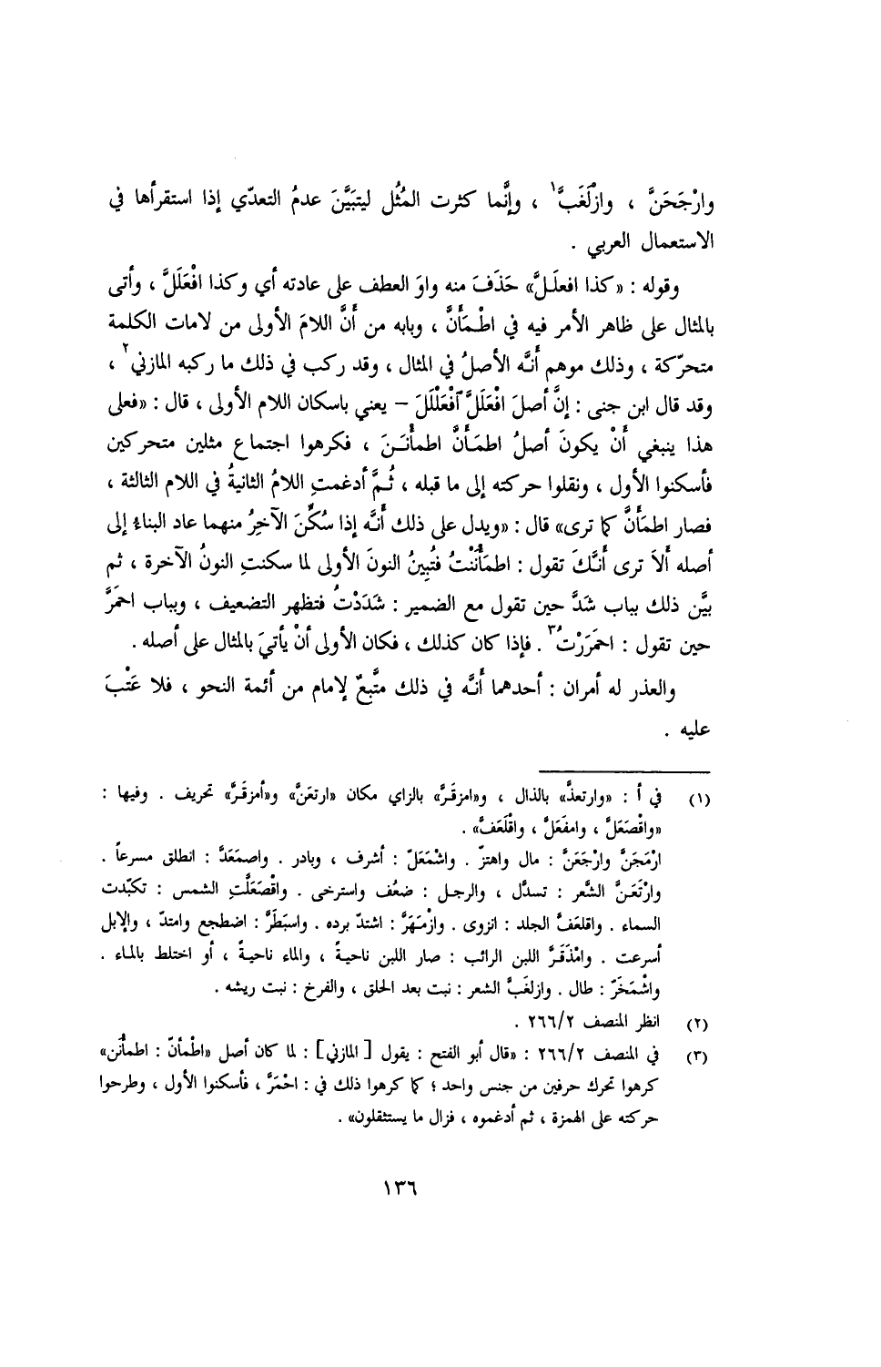 وارجحن، وازلغب، وإنما كثرت المثل ليتبين عدم التعدي إذا استقرأها في الاستعمال العربي.