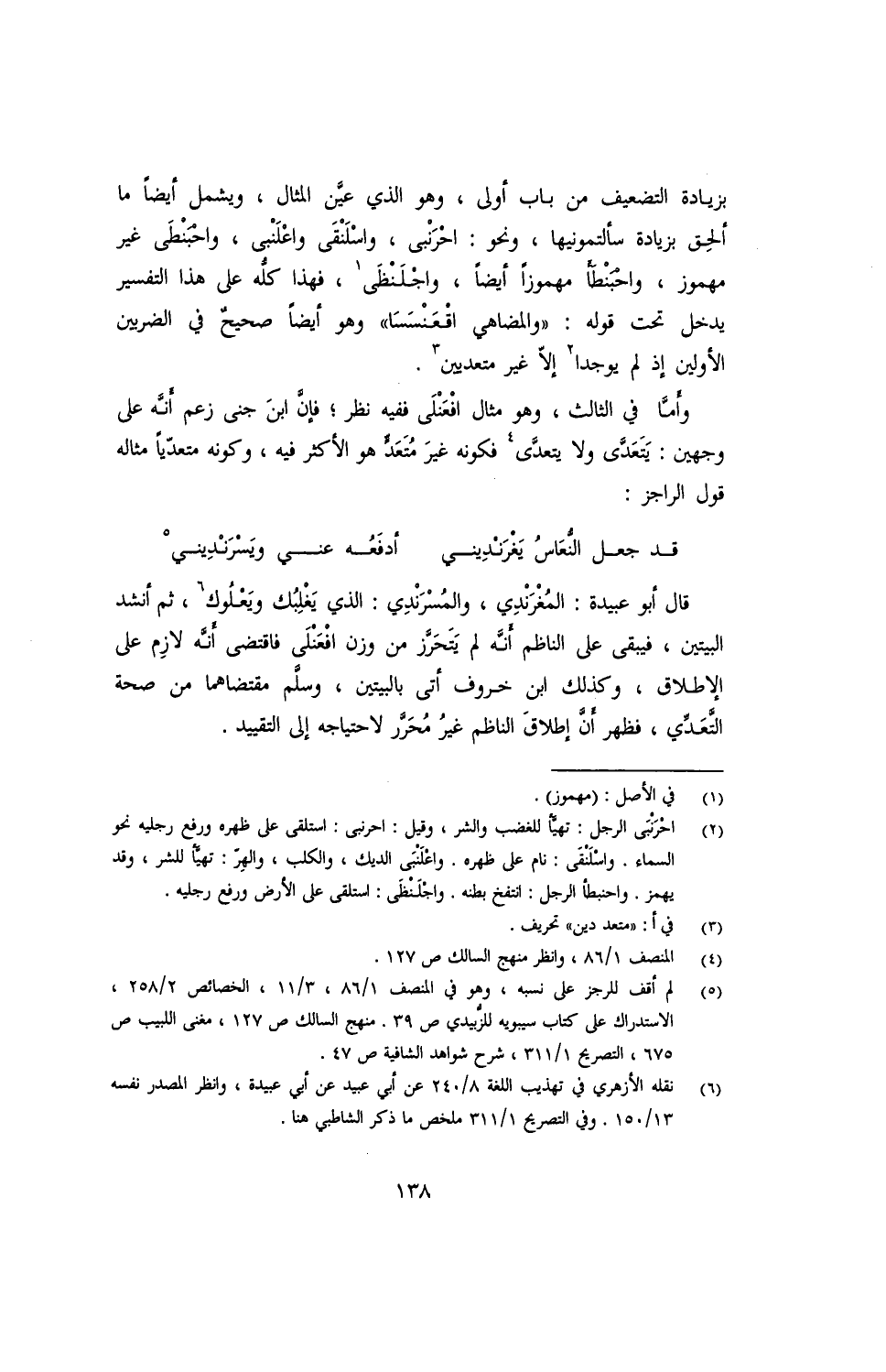وأما في الثالث، وهو مثال افعنلي ففيه نظر فإن ابن جني زعم أنه على وجهين: يتعدى ولا يتعدى فكونه غير متعد هو الأكثر فيه، وكونه متعديا مثاله قول الراجز: