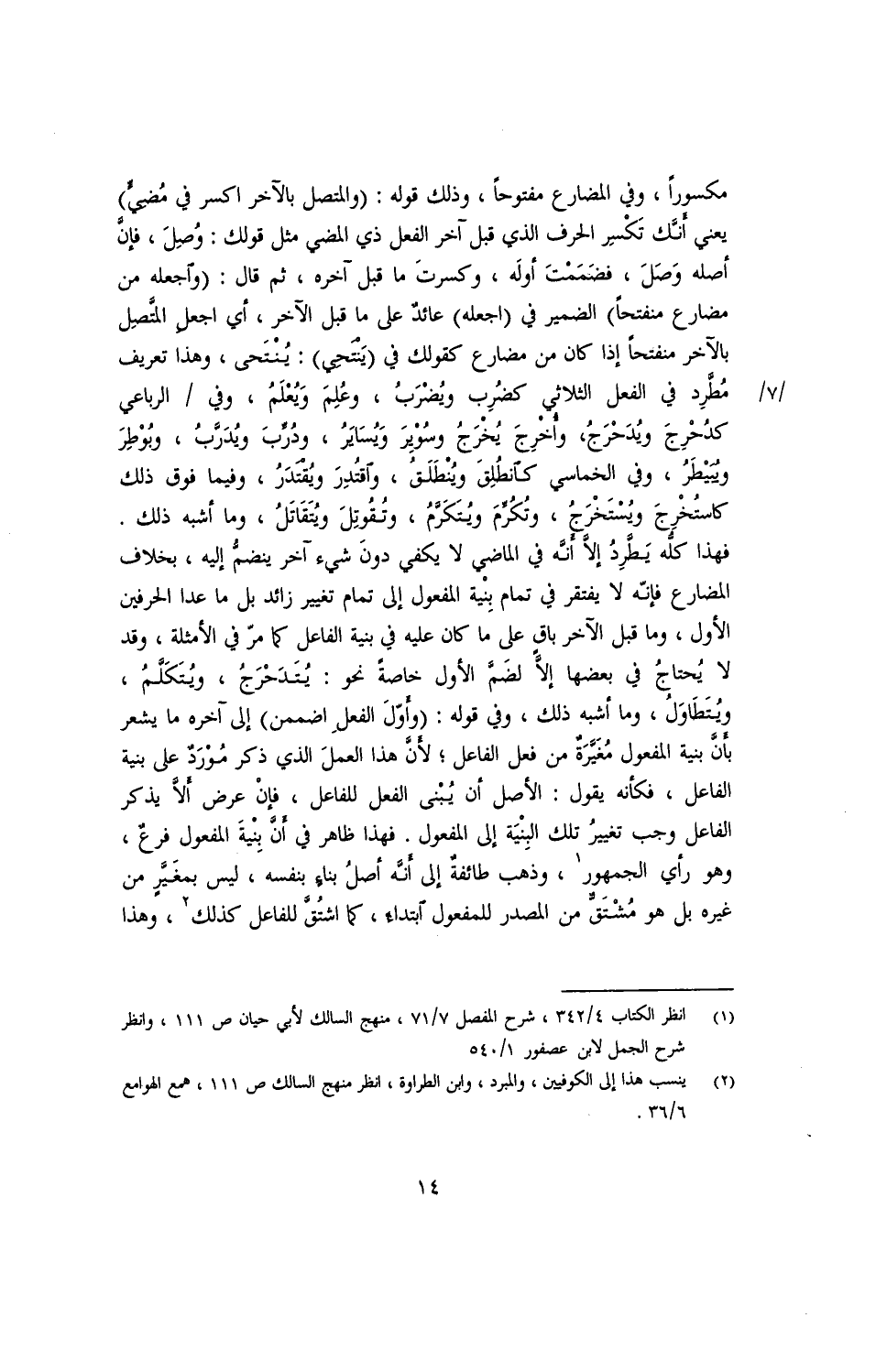 فهذا كله يطرد إلا أنه في الماضي لا يكفي دون شيء آخر ينضم إليه, بخلاف المضارع فإنه لا يفتقر في تمام بنية المفعول إلى تمام تغيير زاذد بل ما عدا الحرفين الأول, وما قبل الآخر باق على ما كان عليه في بنية الفاعل كما مر في الأمثلة, وقد لا يحتاج في بعضها إلا لضم الأول خاصة نحو: يُتَدَحرجُ, ويُتَكلّم, ويُتَطاول, وما أشبه ذلك, وفي قوله: (وأول الفعل اضممن) إلى آخره ما يشعر بأن بنية المفعول مغيرة من فعل الفاعل؛ لأن هذا العمل الذي ذكر مورد على بنية الفاعل, فكأنه يقول: الأصل أن يبنى الفعل للفاعل, فإن عرض ألا يذكر الفاعل وجب تغيير تلك البنية إلى المفعول. فهذا ظاهر في أن بنية المفعول فرع, وهو رأي الجمهور, وذهب طائفة إلى أنه أصل بناء بنفسه, ليس بمغير من غيره بل هو مشتق من المصدر للمفعول ابتداء, كما اشتق للفاعل كذلك, وهذا