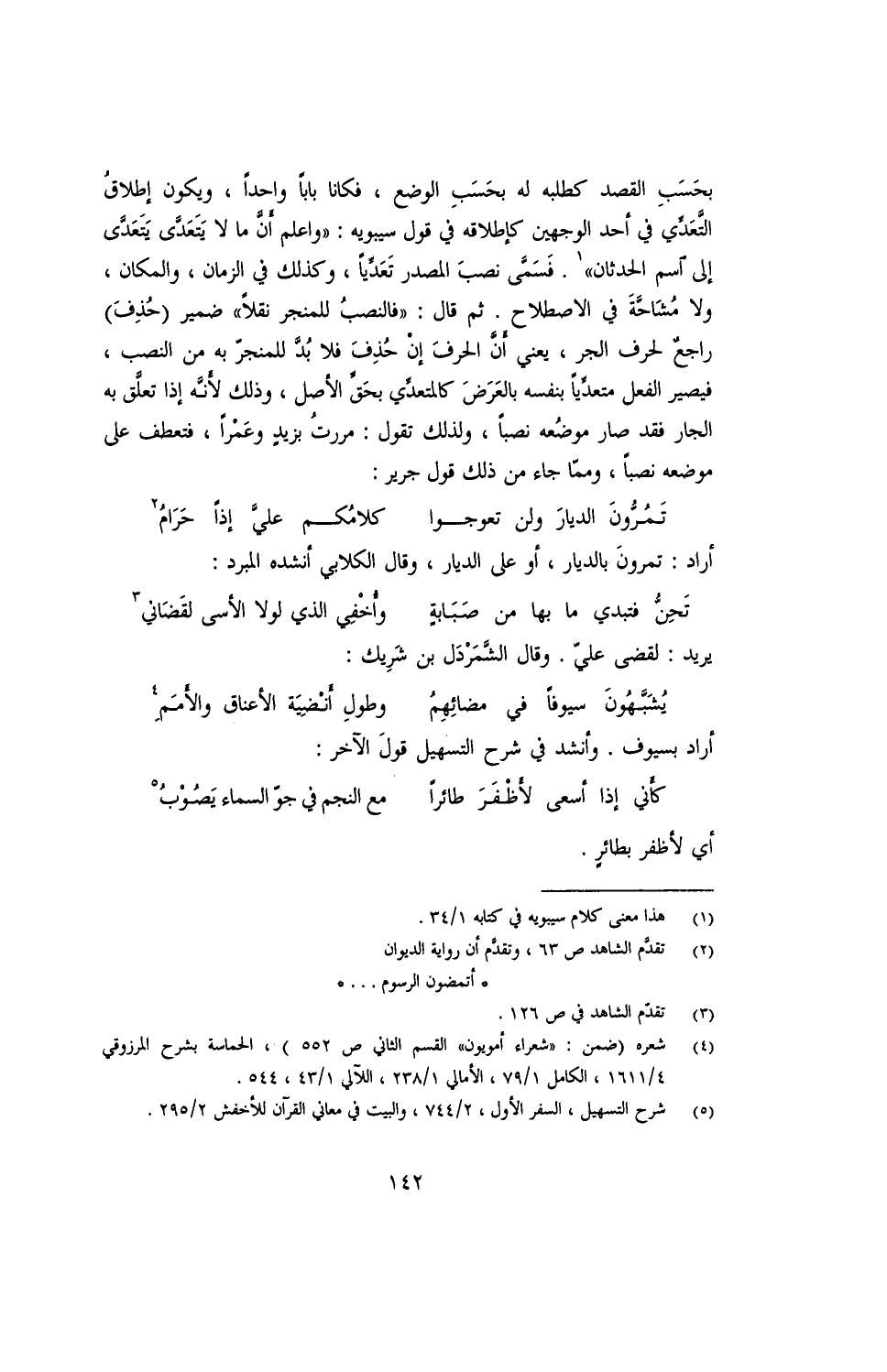 بحسب القصد كطلبه له بحسب الوضع، فكانا بابا واحدا، ويكون إطلاق التعدي في أحد الوجهين كإطلاقه في قول سيبويه: "واعلم أن ما لا يتعدى يتعدى إلى اسم الحدثان". فسمى نصب المصدر تعديا، وكذلك في الزمان، والمكان، ولا مشاحة في الاصطلاح، ثم قال: "فالنصب للمنجر نقلا" ضمير (حذف) راجع لحرف الجر، يعني أن الحرف إن حذف فلا للمنجر به من النصب، فيصير الفعل متعديا بنفسه بالعرض كالمتعدي بحق الأصل، وذلك لأنه إذا تعلق به الجار فقد صار موضعه نصبا، ولذلك تقول: مررت بزيد وعمرا، فتعطف على موضعه نصبا، ومما جاء من ذل قول جرير: