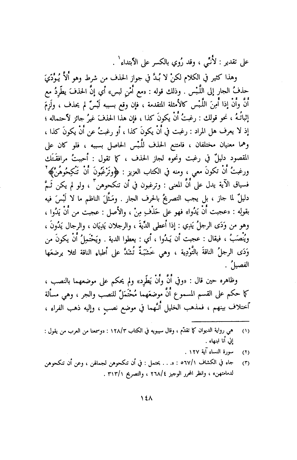 وهذا كثير في الكلام لكن لا بد في جواز الحذف من شرط وهو ألا يودي حذف الجار إلى اللبس. وذلك قوله: "مع أمن لبس" أي إن الحذف يطرد مع أن وأن إذا أمن اللبس كالأمثلة المتقدمة، فإن وقع بسببه لبس لم يحذفن ولزم إثباته، نحو قولك: رغبت أن يكون كذا، فإن هذا الحذف غير جائز لاحتماله؛ إذ لا يعرف هل المراد: رغبت في أن يكون كذا، أو رغبت عن أن يكون كذا، وهما معنيان مختلفان، فامتنع الحذف للبس الحاصل بسببه، فلو كان على المقصود دليل في رغبت ونحوه لجاز الحذف، كما تقول: أحببت مرافقتك ورغبت أن تكون معي، ومنه في الكتاب العزيز: {وترغبون أن تنكحوهن} فسياق الآية يدل على أن المعنى: وترغبون في أن تنكحوهن، ولو لم يكن ثم دليل لما جاز، بل يجب التصريح بالحرف الجار. ومثل الناظم ما لا لبس فيه بقوله: "عجبت أن يدوا" فهو على حذف من، والأصل: عجبت من أن يدوا، وهو من ودى الرجل يدي: إذا أعطى الدية، والرجلان يديان، والرجال يدون، وينصب، فيقال: عجبت أن يدوا، أي: يعطوا الدية. ويحتمل أن يكون من ودى الرجل الناقة بالتودية، وهي خشبة تشد على أطباء الناقة لئلا يرضعها الفصيل.
