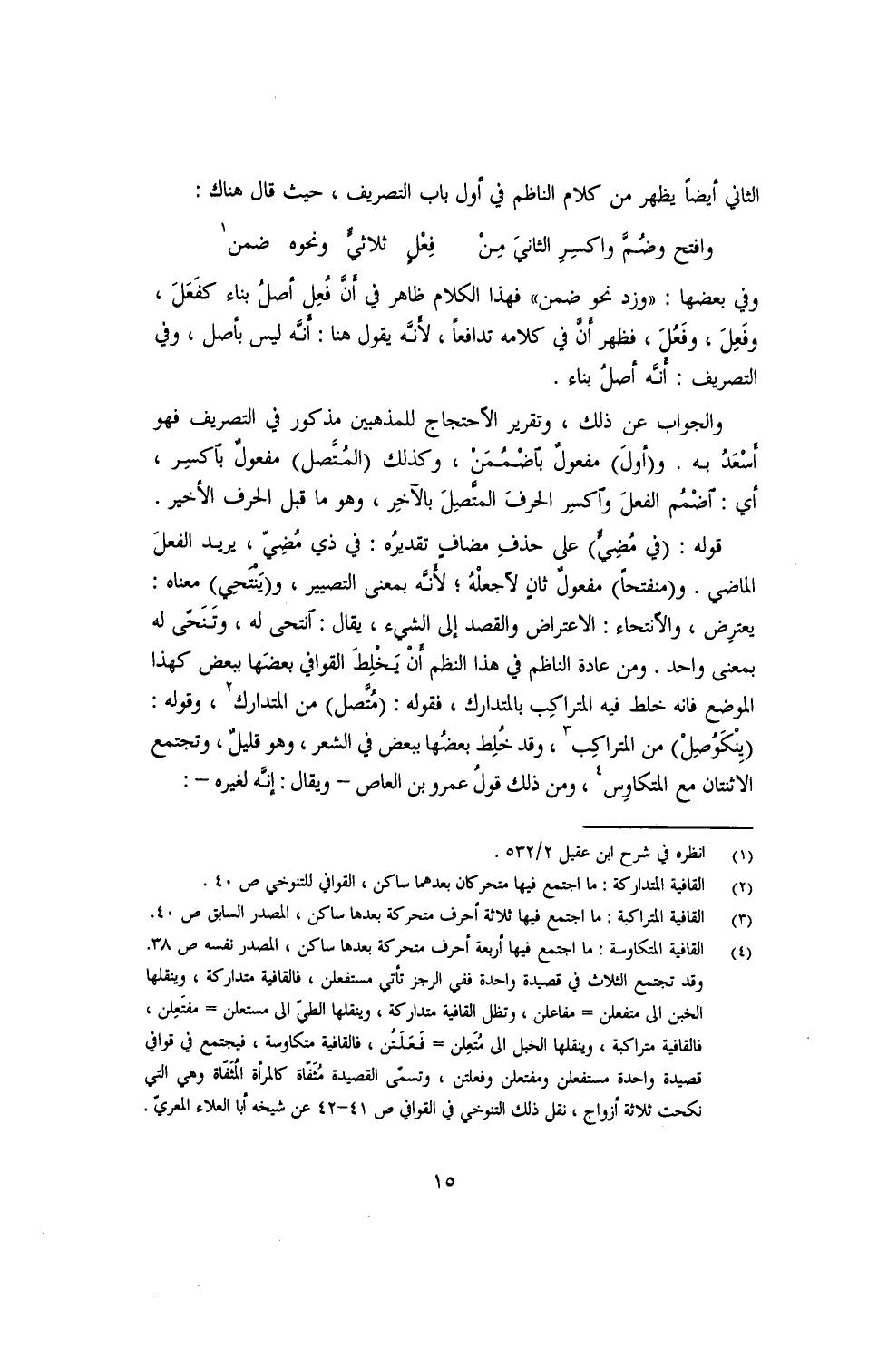 قوله (في مضي) على حذف مضاف تقديره: في ذي مضي, يريد الفعل الماضي. و (منفتحًا) مفعول ثان لاجعله, لأنه بمعنى التصيير, و (ينتحي) معناه: بعترض, والانتحاء: الاعتراض والقصد إلى الشيء, ويقال انتحى له, وتنحى له بمعنى واحد. ومن عادة الناظم في هذا النظم أن يخلط القوافي بعضها بببعض كهذا الوضع فإنه خلط فيه المتراكب بالمتدارك, فقوله: (متصل) من المتدارك, وقوله: (يِنكوصِل) من المتراكب, وقد خلط بعضها ببعض في الشعر, وهو قليل, وتجتمع الاثنتان مع المتكاوس, ومن ذلك قول عمرو بن العاص- ويقال: إنه لغيره-: