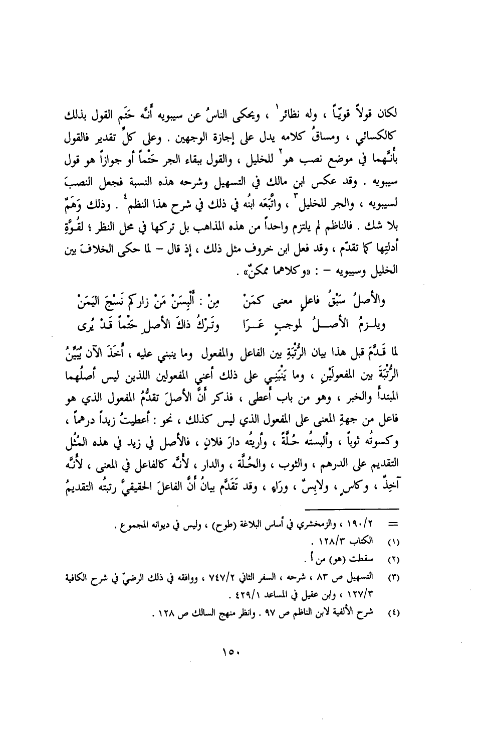 لكان قولا قويا، وله نظائر، ويحكي الناس عن سيبويه أنه حتم القول بذل كالكسائي، ومساق كلامه يدل على إجازته الوجهين. وعلى كل تقدير فالقول بأنهما في موضع نصب هو للخليل، والقول ببقاء الجر حتما أو جوازا هو قول سيبويه. وقد عكس ابن مالك في التسهيل وشرحه هذه النسبة فيجعل النصب لسيبويه، والجر للخليل، واتبعه ابنه في ذلك في شرح هذا النظم. وذلك وهم بلا شك. فالناظم لم يلتزم واحدا من هذه المذاهب بل تركها في محل النظر؛ لقوة أدلتها كما تقدم، وقد فعل ابن خروف مثل ذلك، إذ قال- لما حكى الخلاف بين الخليل وسيبويه-: "وكلاهما ممكن".