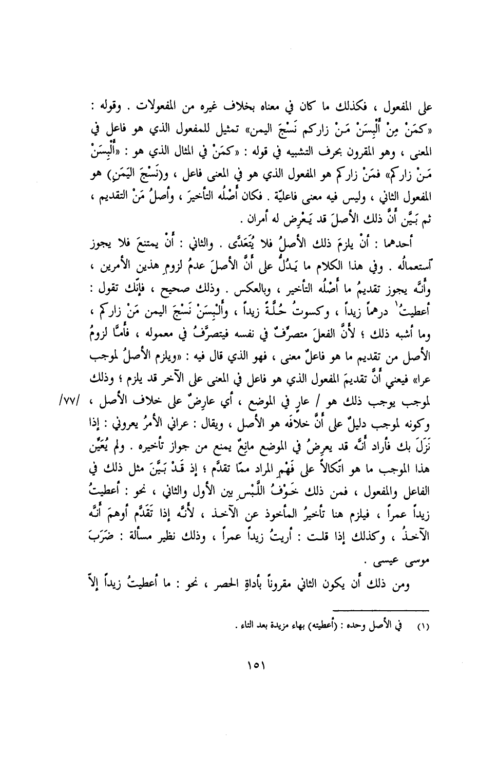 أحدهما: أن يلزم ذلك الأصل فلا يتعدى. والثاني: أن يمتنع فلا يجوز استعماله. وفي هذا الكلام ما يدل على أن الأصل عدم لزوم هذين الأمرين، وأنه يجوز تقديم ما أصله التأخير، وبالعكس. وذلك صحيح، فإنك تقول: أعطيت درهما زيدا، وكسوت حلة زيدا، وألبسن نسج اليمن من زار كم، وما أشبه ذلك؛ فأن الفعل متصرف في نفسه فيتصرف في معموله، فأما لزوم الأصل من تديم ما هو فاعل معنى، فهو الذي قال فيه: "ويلزم الأصل لموجب عرا" فيعني أن تقديم المفعول الذي هو فاعل في المعنى على الآخر قد يلزم؛ وذلك لموجب يجب ذلك هو/ عار في الموضع، أي عارض على خلاف الأصل، وكونه لموجب دليل على أن خلافه هو الأصل، ويقال: عراني الأمر يعروني: إذا نزل بك فأراد أنه قد يعرض في الموضع مانع يمنع من جواز تأخيره. ولم يعين هذا الموجب ما هو اتكالا على فهم المراد مما تقدم؛ إذ قد بين مثل ذل في الفاعل والمفعول، فمن ذلك خوف اللبس بين الأول والثاني، نحو: أعطيت زيدا عمرا، فيلزم هنا تأخير المأخوذ عن الآخذ، لأنه إذا تقدم أوهم أنه الآخذ، وكذلك إذا قلت: أريت زيدا عمرا، وذلك نظير مسألة: ضرب موسى عيسى.