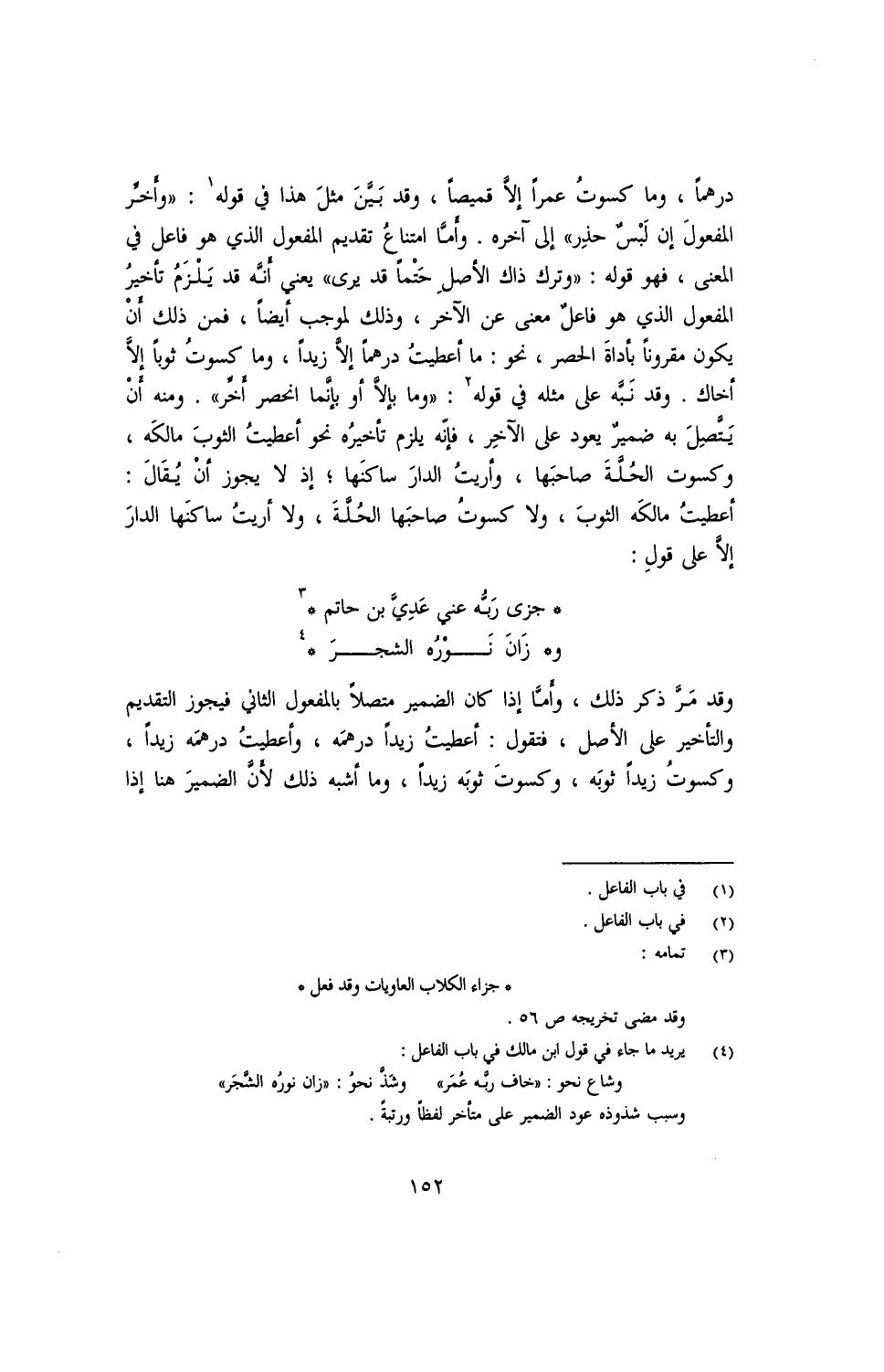 درهماً، وما كسوت عمرا إلا قميصا، وقد بين مثل هذا في قوله: "وأخر المفعول إن لبس حذر" إلى آخره. وأما امتناع تقديم المفعول الذي هو فاعل في المعنى، فهو قوله: "وترك ذاك الأصل حتما قد يرى" يعني أنه قد يلزم تأخير المفعول الذي هو فاعل معنى عن الآخر، وذلك لموجب أيضا، فمن ذلك أن يكون مقرونا بأداة الحصر، نحو: ما أعطيت درهما إلا زيدا، وما كسوت ثوبا إلا أخاك. وقد تنبه على مثله في قوله: "وما بإلا أو بإنما انحصر أخر". ومنه أن يتصل به ضمير يعود على الآخر، فإنه يلزم تأخيره نحو أعطيت الثوب مالكه، وكسوت الحلة صاحبها، وأريت الدار ساكنها؛ إذ لا يجوز أن يقال: أعطيت مالكه الثوب، ولا كسوت صاحبها الحلة، ولا أريت ساكنها الدار إلا على قول: