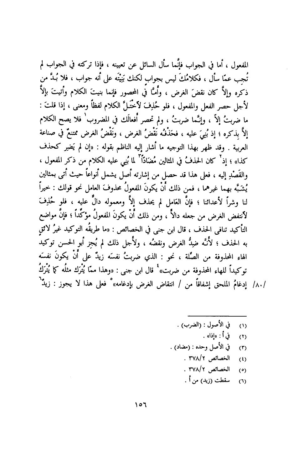 المفعول، أما في الجواب فإنما سأل السائل عن تعيينه، فإذا تركته في الجواب لم تجب عما سأل، فكلامُك ليس بجواب لكنك بنيته على أنه جواب، فلا بد من ذكره وإلا كان نقضَ الغرض، وأما في المحصور فإنما بنيت الكلام وأتيت بإلا لأجل حصر الفعل والمفعول، فلو حذف لاختل الكلام لفظا ومعنى، إذا قلت: ما ضربت إلا، وإنما ضربت، ولم تحصر أفعالك في المضروب فلا يصح الكلام إلا بذكره؛ إذ بني عليه، فحذفه نقض الغرض، ونقض الغرض ممتنع في صناعة العربية. وقد ظهر بهذا التوجيه ما أشار إليه الناظم بقوله: "إن لم يضر كحذف كذا"؛ إذ كان الحذف في المثالين مضادا لما بني عليه الكلام من ذكر المفعول، والقصد إليه، فعلى هذا قد حصل من إشارته أصل يشمل أنواعا حيث أتى بمثالين يشبه بهما غيرهما، فمن ذلك أن يكون المفعول محذوف العامل نحو قولك: خيرا لنا وشرا لأعدائنا؛ فإن العامل لم يحذف إلا ومعموله دال عليه، فلو حذف لانتفض [؟ لانتقض] الغرض من جعله دالا، ومن ذلك أن يكون المفعول مؤكِّدا؛ فإن مواضع التأكيد تنافي الحذف، قال ابن جني في الخصائص: "وما طريقه التوكيد غير لائق به الحذف؛ لأنه ضد الغرض ونقضه، ولأجل ذلك لم يجز أبو الحسن توكيد الهاء المحذوفة من الصلة، نحو: الذي ضربتُ نفسَه زيدٌ على أن يكون نفسه توكيدا للهاء المحذوفة من ضربت" قال ابن جني: "وهذا مما يترك مثله كما يترك إدغام الملحق إشفاقا من/ انتقاض الغرض بإدغامه" فعل هذا لا يجوز: زيد