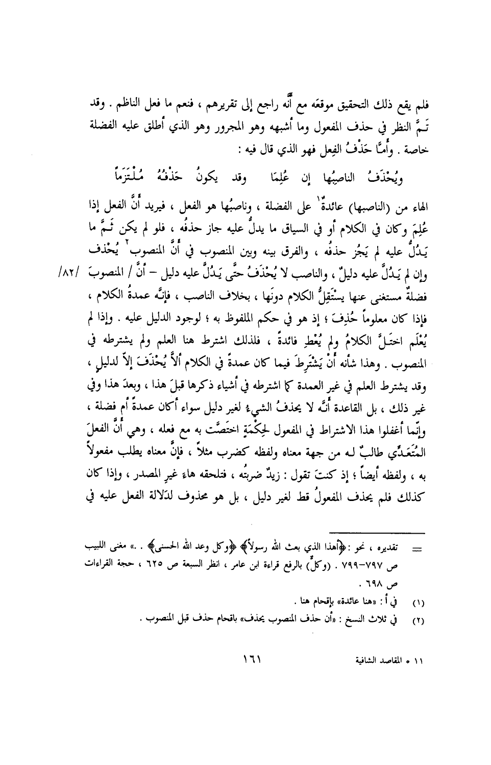 فلم يقع ذلك التحقيق موقعه مع أنه راجع إلى تقريرهم، فنعم ما فعل الناظم. وقد تم النظر في حذف المفعول وما أشبهه وهو المجرور وهو الذي أطلق عليه الفضلة خاصة. وأما حذف الفعل فهو الذي قال فيه:
