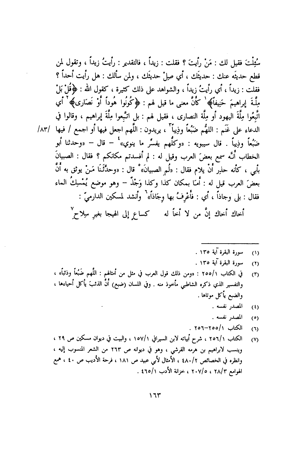 سئلت فقيل لك: من رأيت: فقلت: زيدا، فالتقدير: رأيت زيدا، وتقول لمن قطع حديثه عنك: حديثك، أي صل حديثك، ولمن سألك: هل رأيت أحدا؟ فقلت: زيدا، أي رأيت زيدا، والشواهد على ذلك كثيرة، كقول الله: {قل بل ملة إبراهيم حنيفا} كأن معنى ما قيل لهم: {كونوا هودا أو نصارى} أي اتبعوا ملة اليهود أو ملة النصارى، فقيل لهم: بل اتبعوا ملة إبراهيم، وقالوا في الدعاء على غنم: اللهم ضبعا وذيبا، يريدون: اللهم اجعل فيها أو اجمع/ فيها ضبعا وذيبا. قال سيبويه: "وكلهم يفسر ما ينوي"- قال- "وحدثنا أبو الخطاب أنه سمع بعض العرب وقيل له: لم أفسدتم مكانكم؟ فقال: الصبيان بأبي، كأنه حذا أن يلام فقال: "لم الصبيان" قال: "وحدثنا من يوثق به أن بعض العرب قيل له: أما بمكان كذا وكذا وجذ- وهو موضع يمسك الماء فقال: بلى وجاذا، أي: فأعرف بها وجاذا" وأنشد لمسكين الدارمي: