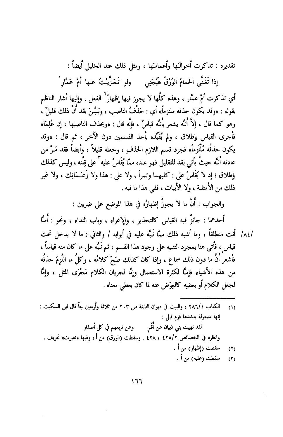 أحدهما: جائز فيه القياس كالتحذير، والإغراء، وباب النداء، ونحو: أما أنت منطلقا، وما أشبه ذلك مما نبه عليه في أبواب/ والثاني: ما لا يدخل تحت قياس، فأتى هنا بمجرد التنبيه على وجود هذا القسم، ثم نبه على ما كان منه قياسا، فأشعر أن ما دون ذلك سماع، وإذا كان كذلك صح كلامه، وكل ما التزم حذفه من هذه الأشياء فإما لكثرة الاستعمال وإما لجريان الكلام مجرى المثل، وإما لجعل الكلام أو بعضه كالعوض عنه لما كان يعطي معناه.