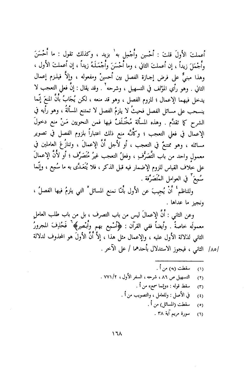 وعن الثاني: أن الإعمال ليس من باب التصرف، بل من باب طلب العامل معموله خاصة. وأيضا ففي القرآن: {أسمع بهم وأبصر} فحذف المجرور الثاني لدلالة الأول عليه، والإعمال مثل هذا، إلا أن الأول هو المحذوف لدلالة الثاني، فيجوز الاستدلال بأحدهما/ على الآخر.