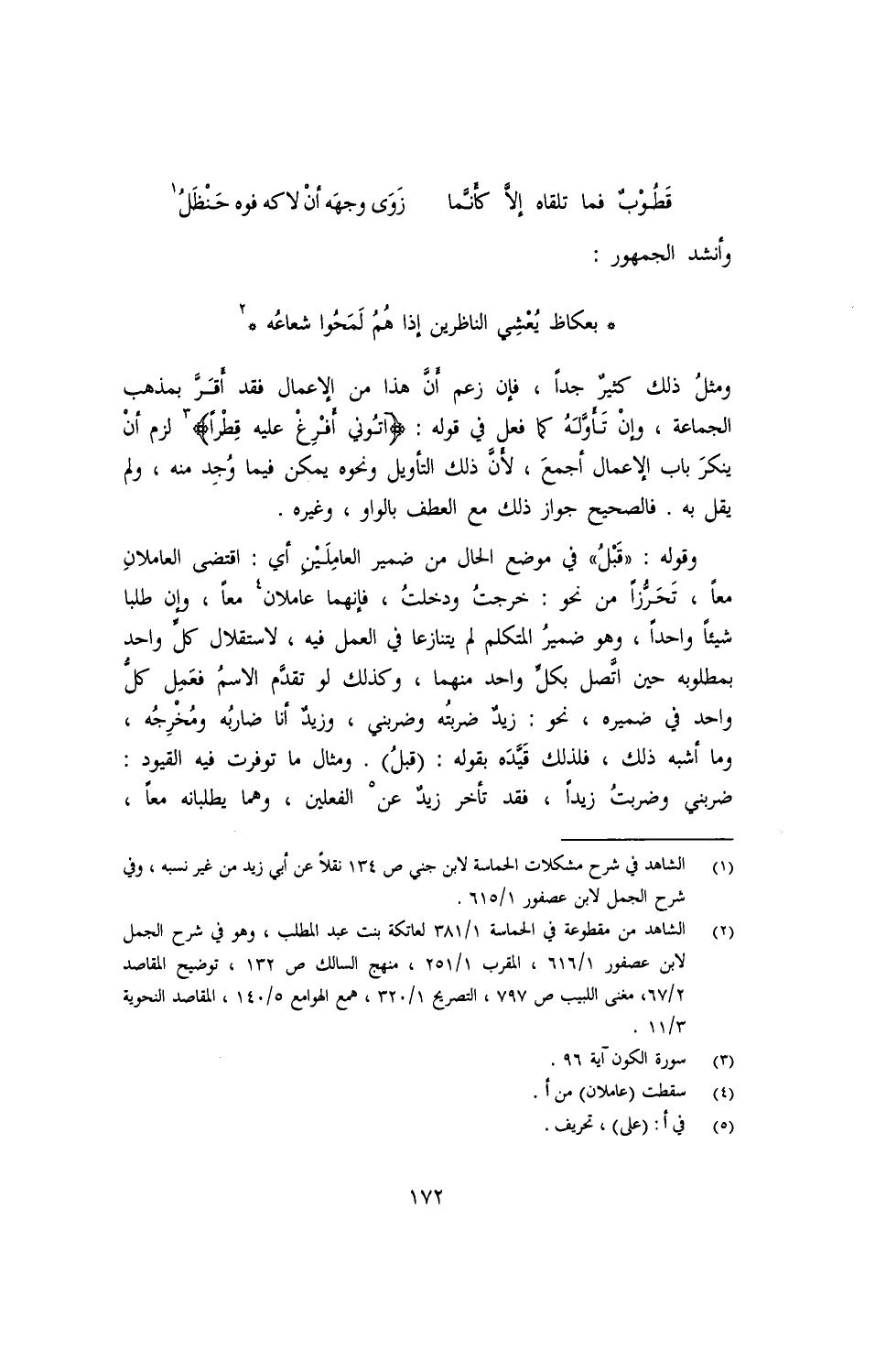 ومثل ذلك كثيرا جدا، فإن زعم أن هذا من الإعمال فقد أٌر بمذهب الجماعة، وإن تأوله كما فعل في قوله: {آتوني افرغ عليه قطرا} لزم أن ينكر باب الإعمال أجمع، لأن ذلك التأويل ونحوه يمكن فيما وجد منه، ولم يقل به. فالصحيح جواز ذلك مع العطف بالواو، وغيره.
