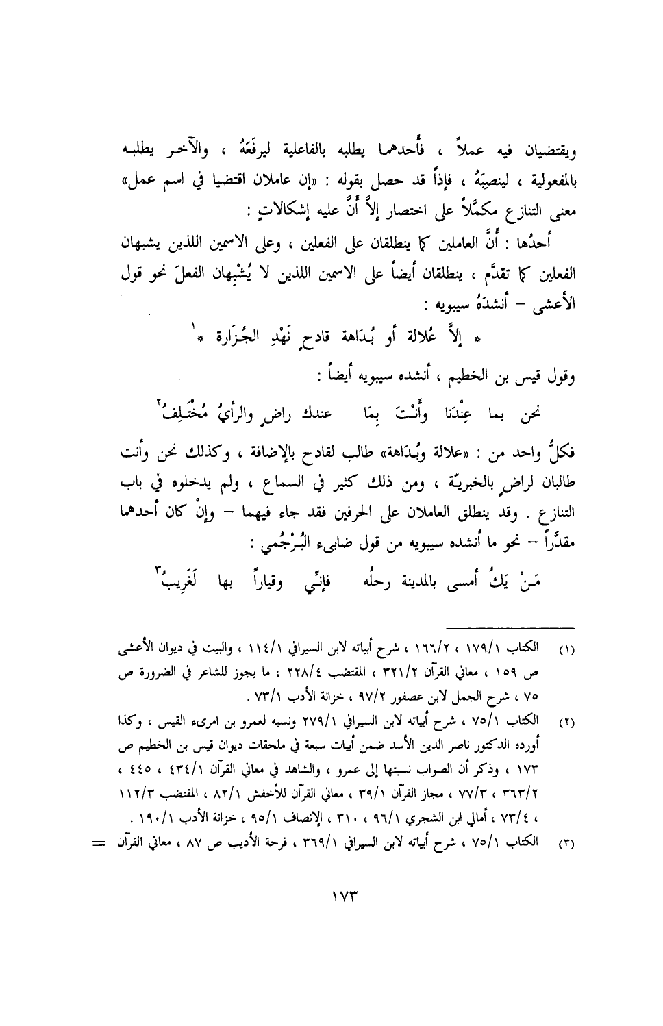 فكل واحد من: "علالة وبداهة" طالب لقادح بالإضافة، وكذلك نحن وأنت طالبان لراض بالخبرية، ومن ذلك كثير في السماع، ولم يدخلوه في باب التنازع. وقد ينطلق العاملان على الحرفين فقد جاء فيهما- وإن كان أحدهما مقدرا- نحو ما أنشده سيبويه من قول ضابيء البرجمي: