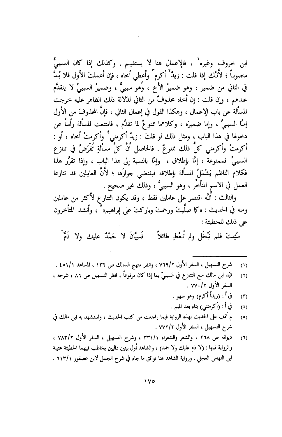 والثالث: أنه اقتصر على عاملين فقط، وقد يكون التنازع لأكثر من عاملين ومنه في الحديث: "كما صليت ورحمت وباركت على إبراهيم"، وأنشد المتأخرون على ذلك للحطيئة: