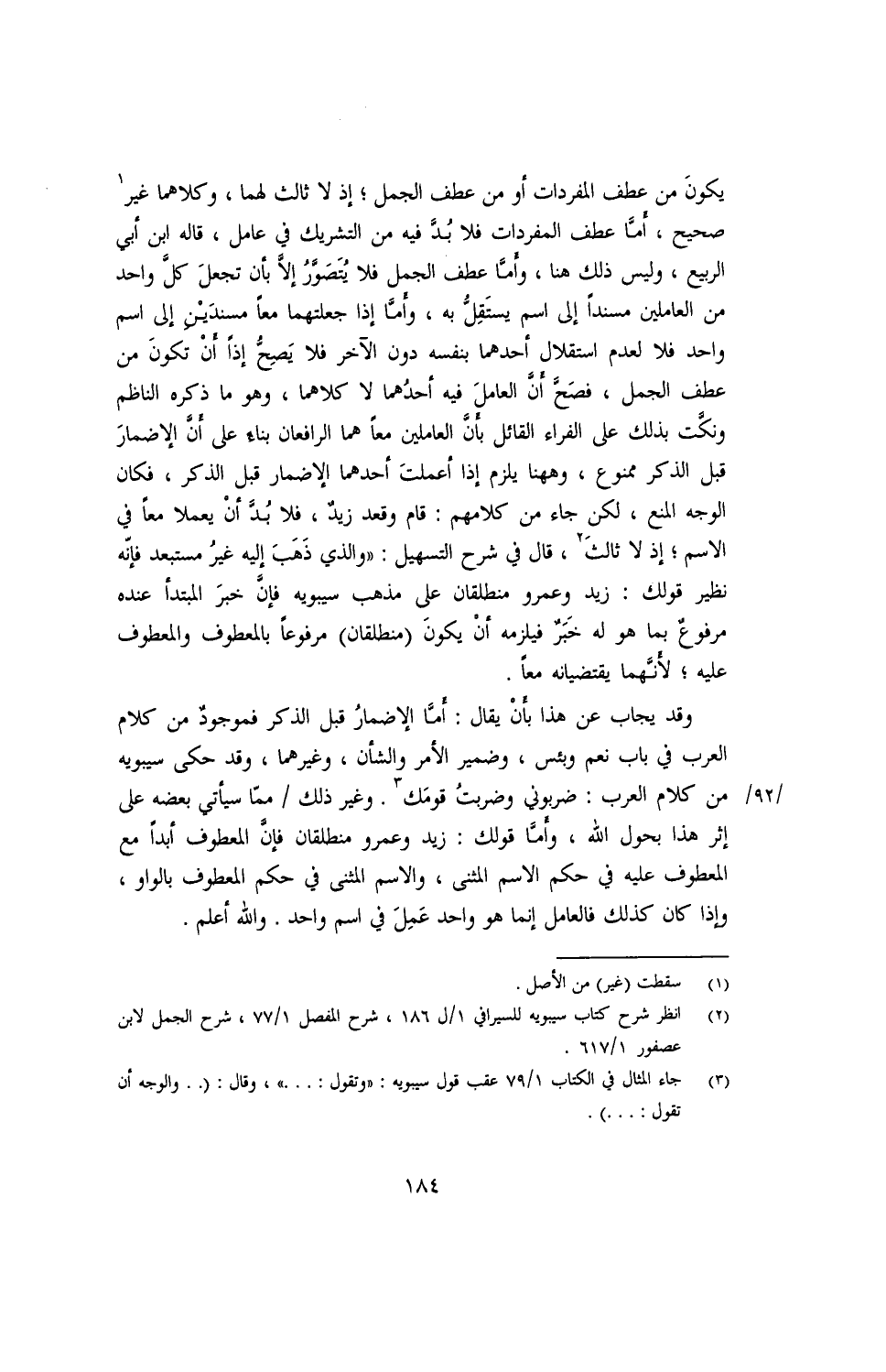 وقد يجاب عن هذا بأن يقال: أما الإضمار قبل الذكر فموجود من كلام العرب في باب نعم وبئس، وضمير الأمر والشأن، وغيرهما، وقد حكى سيبويه من كلام العرب: ضربوني وضربت قومك. وغير ذلك مما سيأتي بعضه على إثر هذا بحول الله، وأما قولك: زيد وعمرو منطلقان فإن المعطوف أبدًا مع المعطوف عليه في حكم الاسم المثنى، والاسم المثنى في حكم المعطوف بالواو، وإذا كان كذلك فالعامل إنما هو واحد عمل في اسم واحد. والله أعلم.