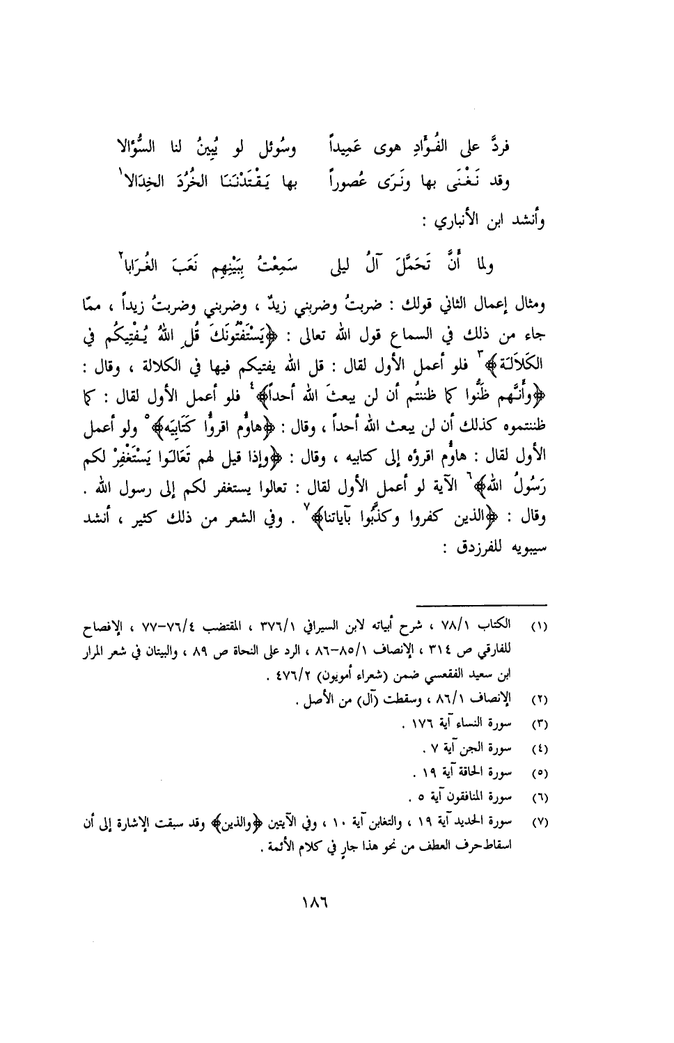 ومثال إعمال الثاني قولك: ضربت وضربني زيدٌ، وضربني وضربت زيدًا، مما جاء من ذلك في السماع قول الله تعالى: {يستفتونك قل الله يفتيكم في الكلالة} فلو أعمل الأول لقال: قل الله يفتيكم فيها في الكلالة، وقال: {وأنهم ظنوا كما ظننتم أن لن يبعث الله أحدًا} فلو أعمل الأول لقال: كما ظننتموه كذلك أن لن يبعث الله أحدًا، وقال: {هاؤم اقرؤا كتابيه} ولو أعمل الأول لقال: هاؤم اقرؤه إلى كتابيه، وقال: {وإذا قيل لهم تعالوا يستغفر لكم رسول الله} الآية لو أعمل الأول لقال: تعالوا يستغفر لكم إلى رسول الله. وقال: {الذين كفرو وكذبوا بآياتنا}. وفي الشعر من ذلك كثير، أنشد سيبويه للفرزدق: