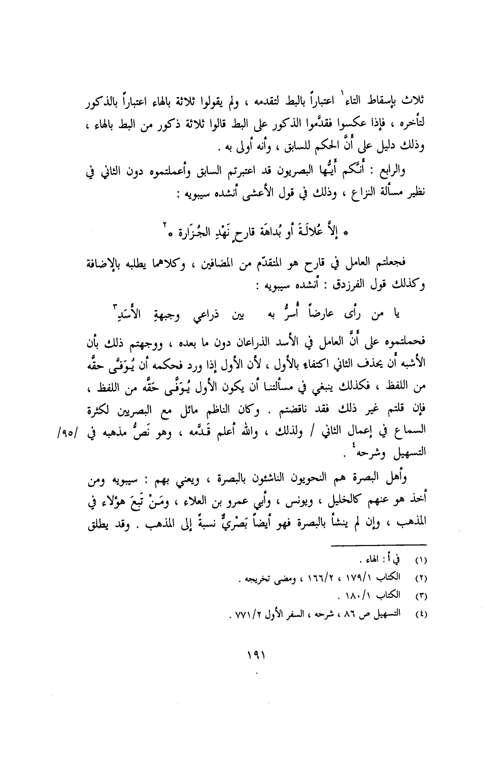 وأهل البصرة هم النحويون الناشئون بالبصرة، ويعني بهم: سيبويه ومن أخذ هو عنهم كالخليل، ويونس، وأبي عمرو بن العلاء، ومن تبع هؤلاء في المذهب، وإن لم ينشأ بالبصرة فهو أيضًا بصري نسبةً إلى المذهب. وقد يطلق
