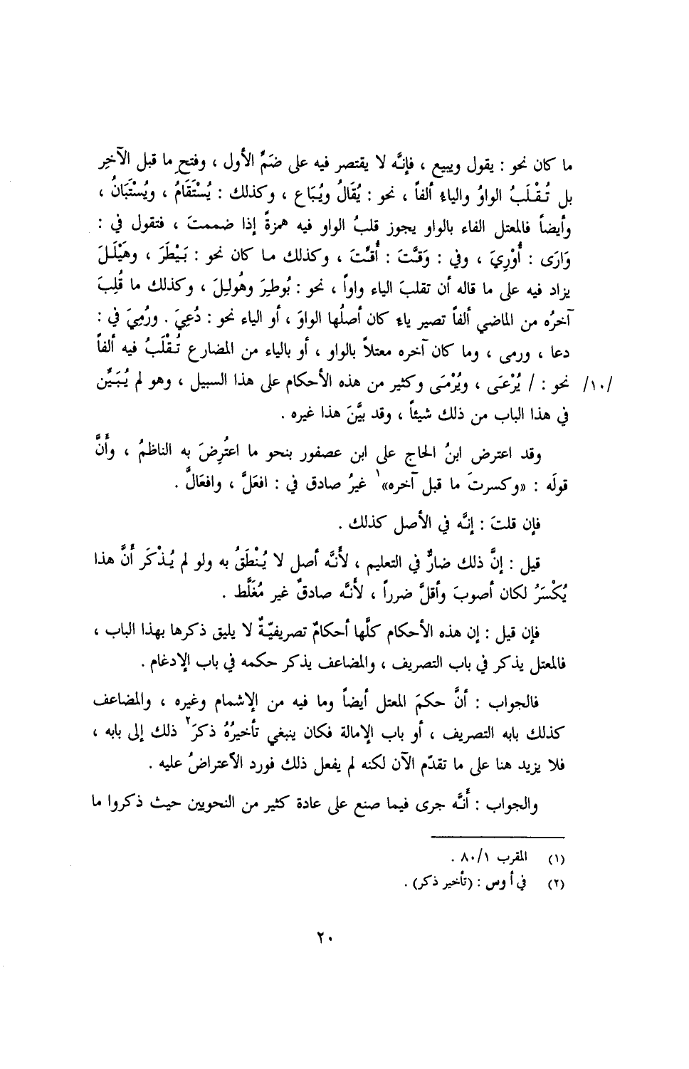 فالجواب: أن حكم المعتل أيضًا وما فيه من الإشمام وغيره, والمضاعف كذلك بابه التصريف, أو باب الإمالة فكان ينبغي تأخيره ذكر ذلك إلى بابه, فلا يزيد هنا على ما تقدّم الآن لكنه لم يفعل ذلك فورد الإعتراض عليه.