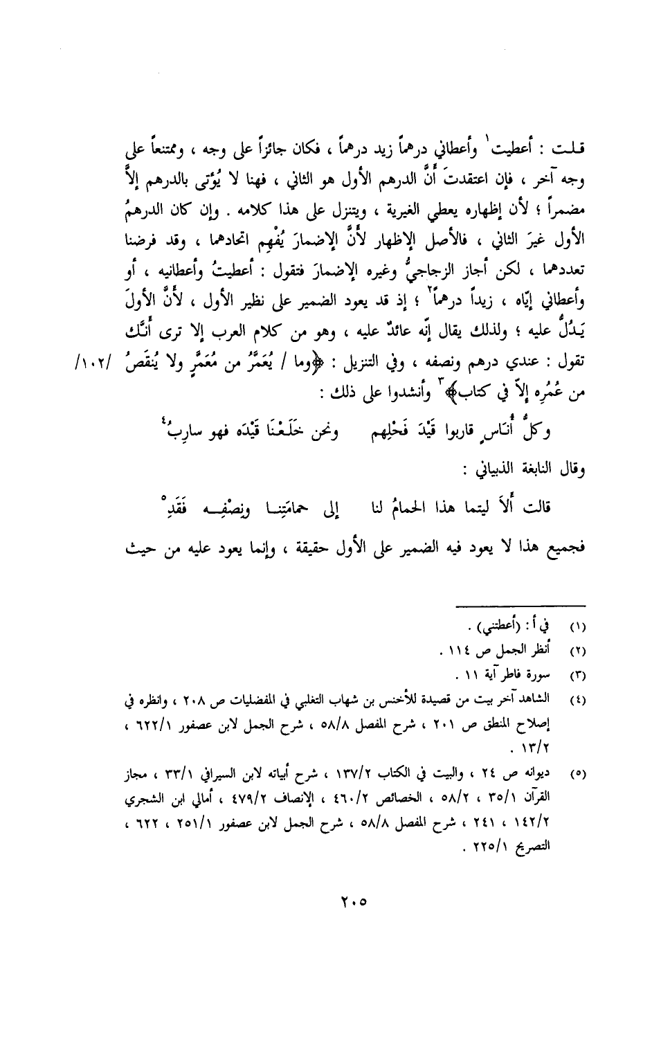 قلت: أعطيت وأعطاني درهمًا زيد درهمًا، فكان جائزًا على وجه، وممتنعًا على وجه آخر، فإن اعتقدت أن الدرهم الأول هو الثاني، فهنا لا يؤتى بالدرهم إلا مضمرًا؛ لأن إظهاره يعطي الغيرية، ويتنزل على هذا كلامه. وإن كان الدرهم الأول غير الثاني، فالأصل الإظهار لأن الإضمار يفهم اتحادهما، وقد فرضنا تعددهما، لكن أجاز الزجاجي وغيره الإضمار فتقول: أعطيت وأعطانيه، أو وأعطاني إياه، زيدًا درهمًا؛ إذ قد يعود الضمير على نظير الأول، لأن الأول يدل عليه؛ ولذلك يقال إنه عائد عليه، وهو من كلام العرب إلا ترى أنك تقول: عندي درهم ونصفه، وفي التنزيل: {وما يعمر من معمرٍ ولا ينقص من عمره إلا في كتاب} وأنشدوا على ذلك: